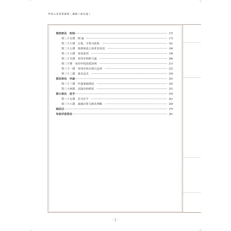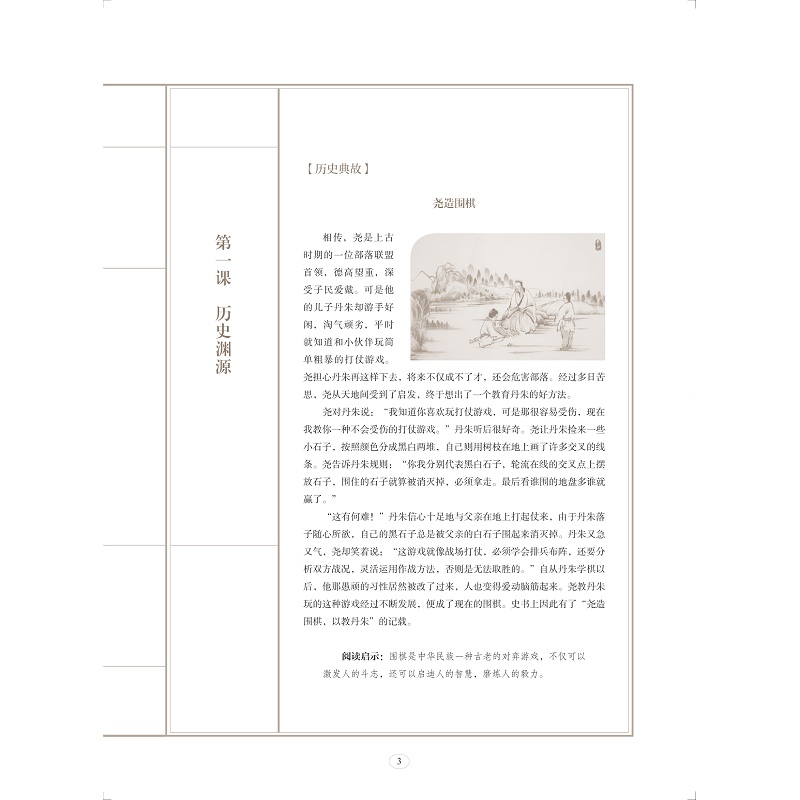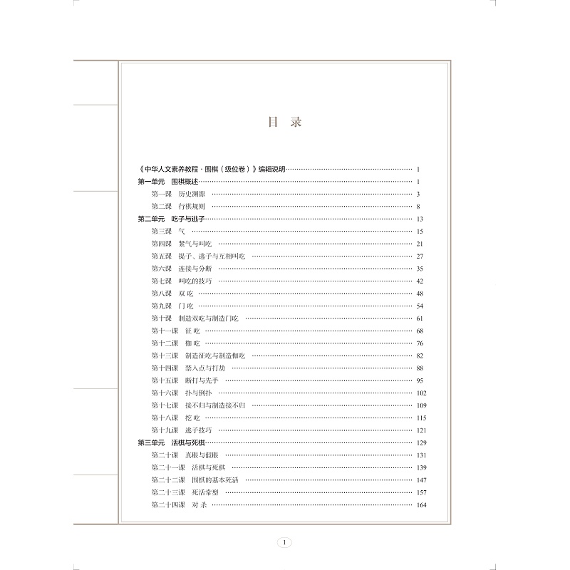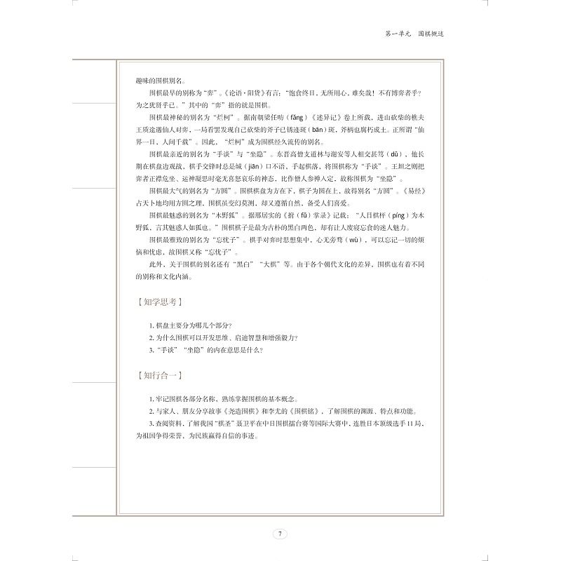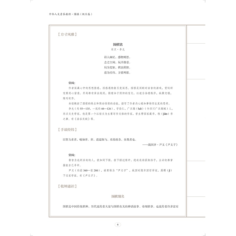 根据国家《关于实施中华优秀传统文化传承发展工程的意见》精神,以浙江大学人文学院为学术背景,乾学书院人文素养教研所为编辑主体,全国才艺测评委员会为监制单位,历时三年,完成了“中华人文素养教育通用教材”这一幼儿及青少年的传统文化读物系列。此套《围棋卷》教程按照“乐在棋中,精艺博学”的教学理念设置课程大纲,教程由六个单元组成,共36课。每课由历史典故、基础知识、基本技能、诗棋经纬、乐在棋中、乾坤通识、知学思考和课外延伸等部分构成;根据不同内容,各个部分具体可分为示例、解析、赏析、思考、练习等。该教材的特色是通过与国学经典、古诗词等文学的对接,将品德教育渗透于围棋技能教学之中,并挖掘中国棋道内在的精神,让学生在学下围棋中得到意志力的锻炼。