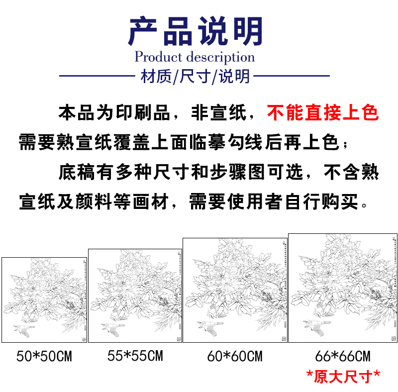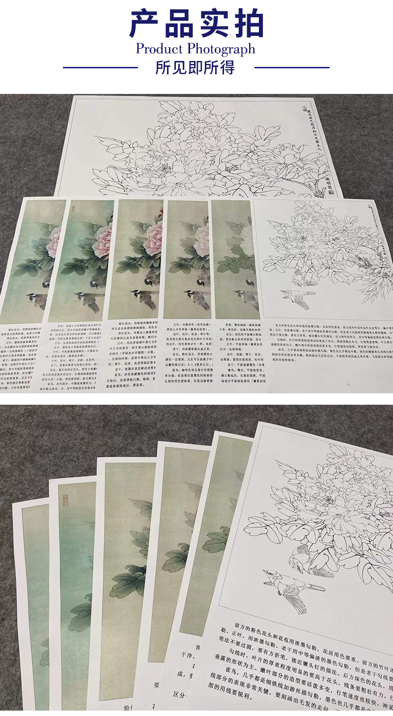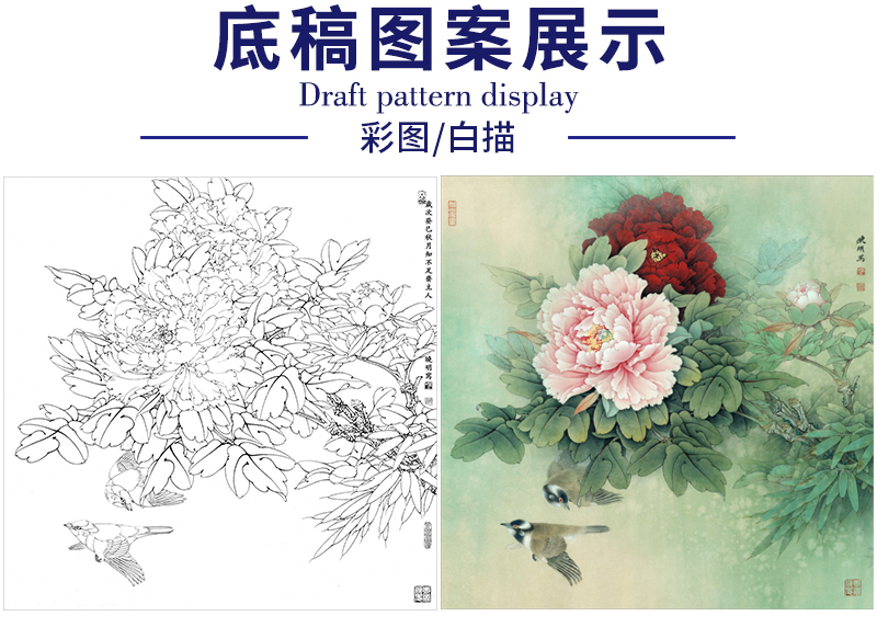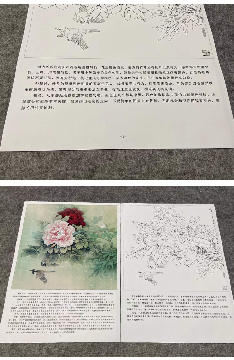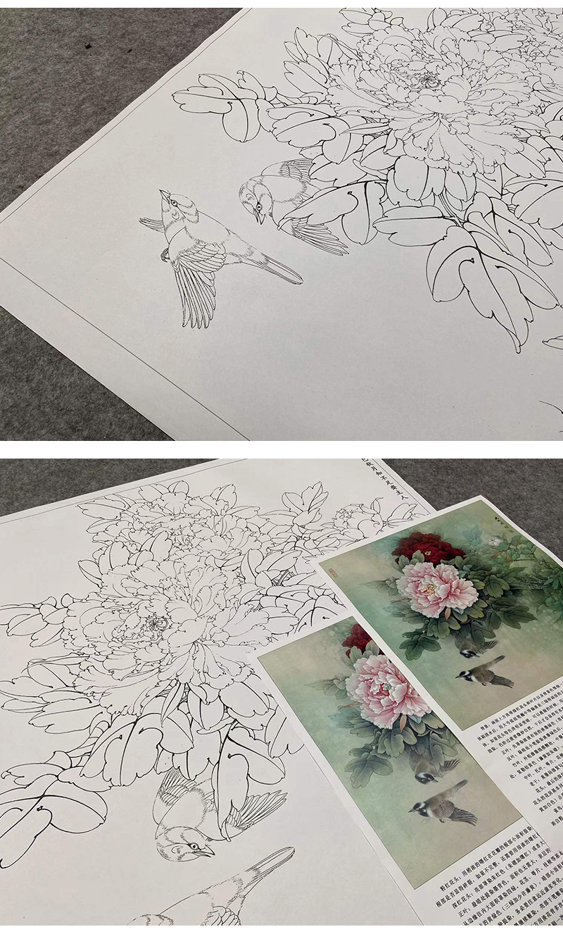 【有步骤、大彩图】李晓明工笔画白描底稿斗方小品《二乔白头》牡丹初学者临摹花鸟线稿KL21