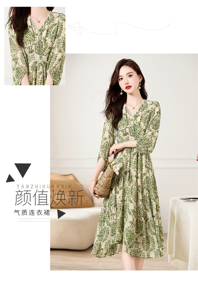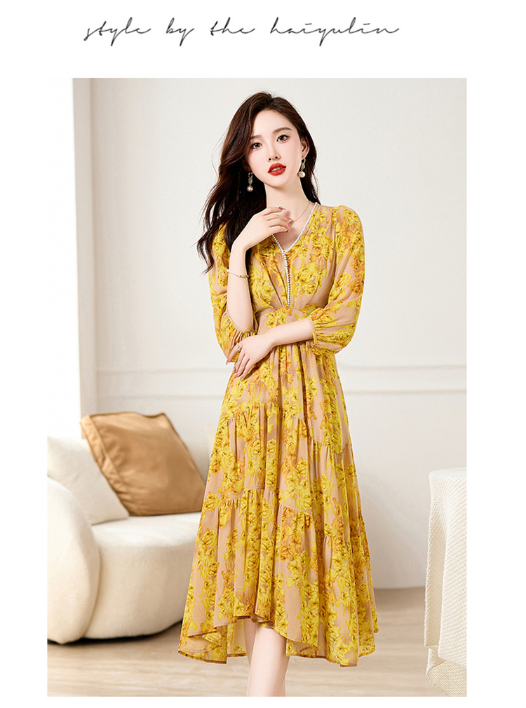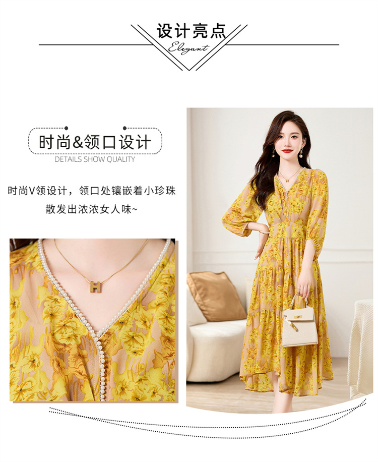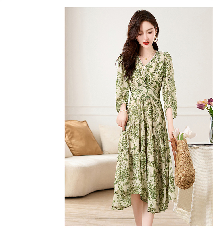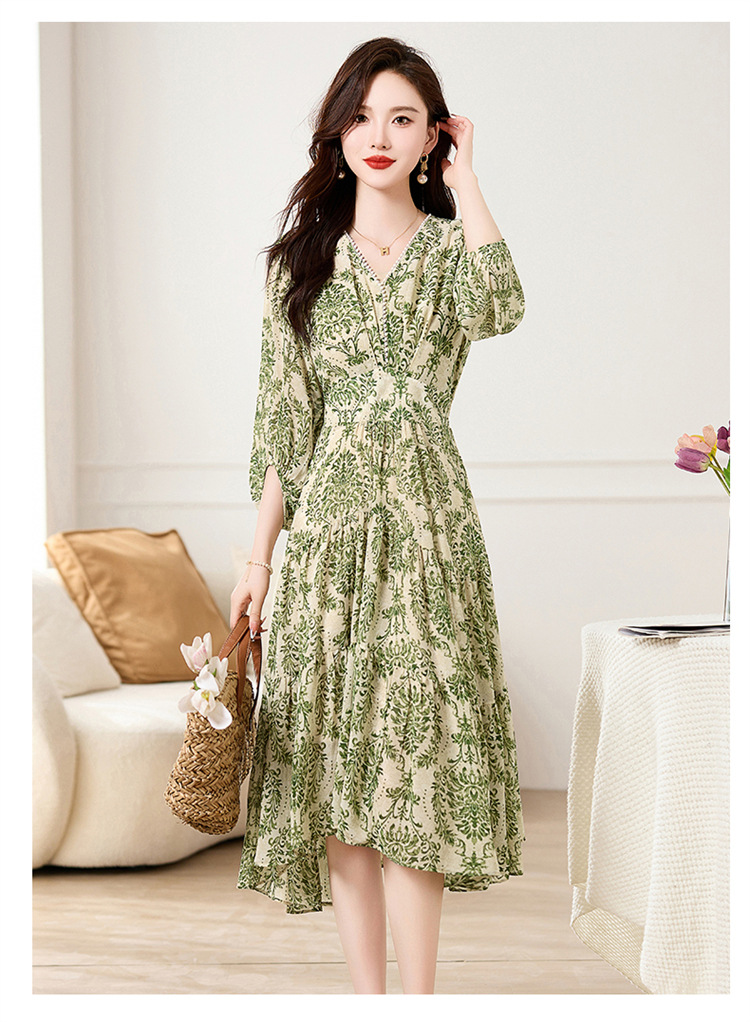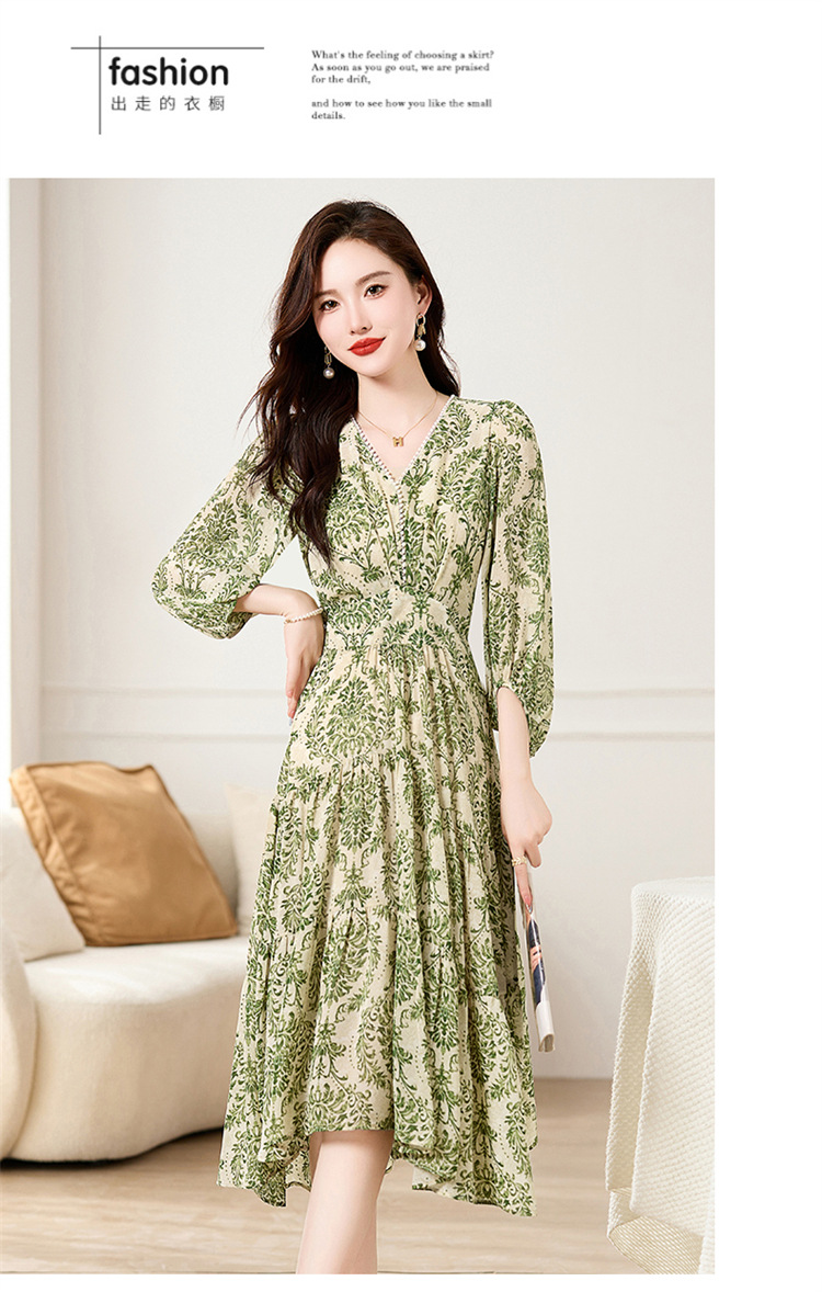 HR XXM619气质串珠V领印花连衣裙拼接显瘦不规则裙摆