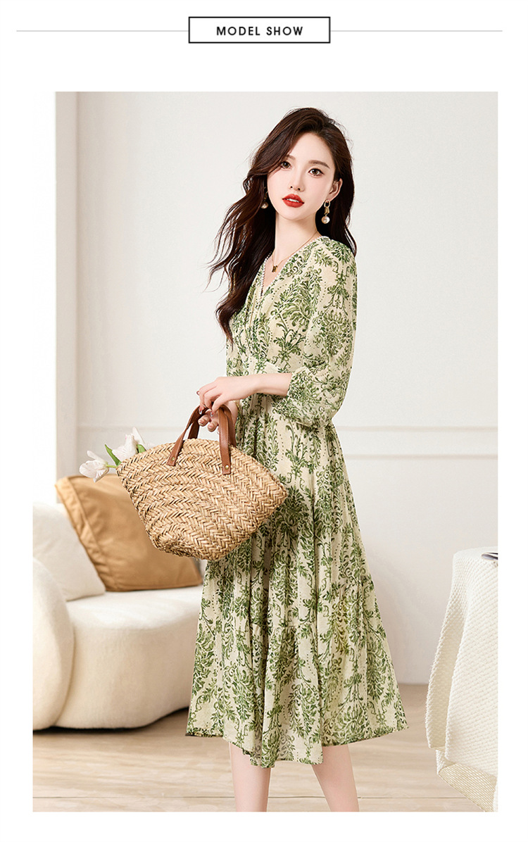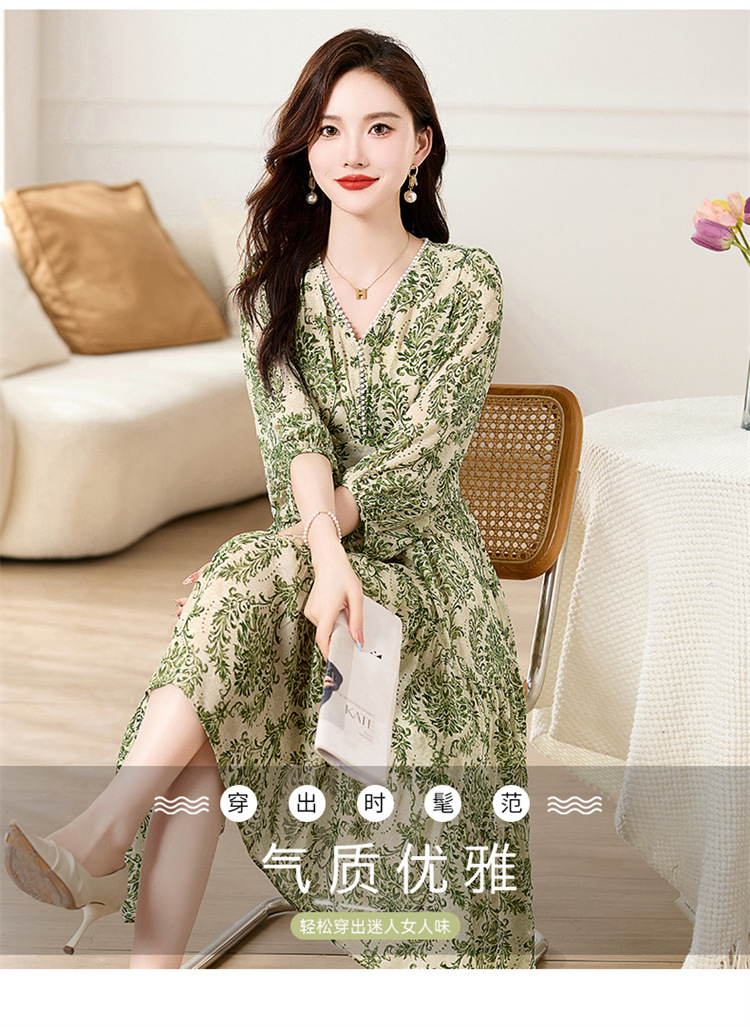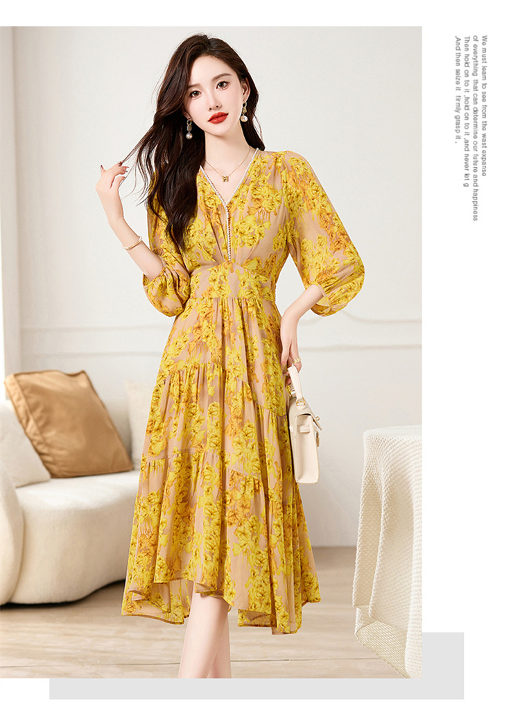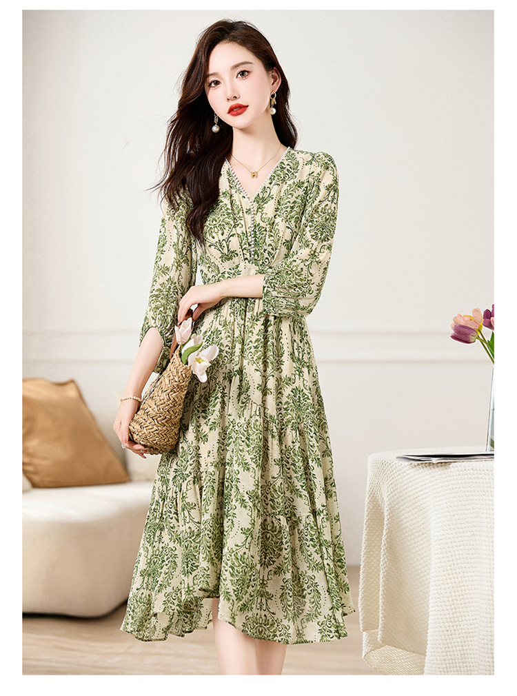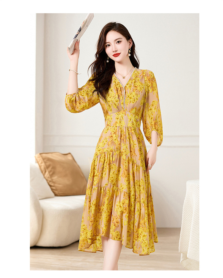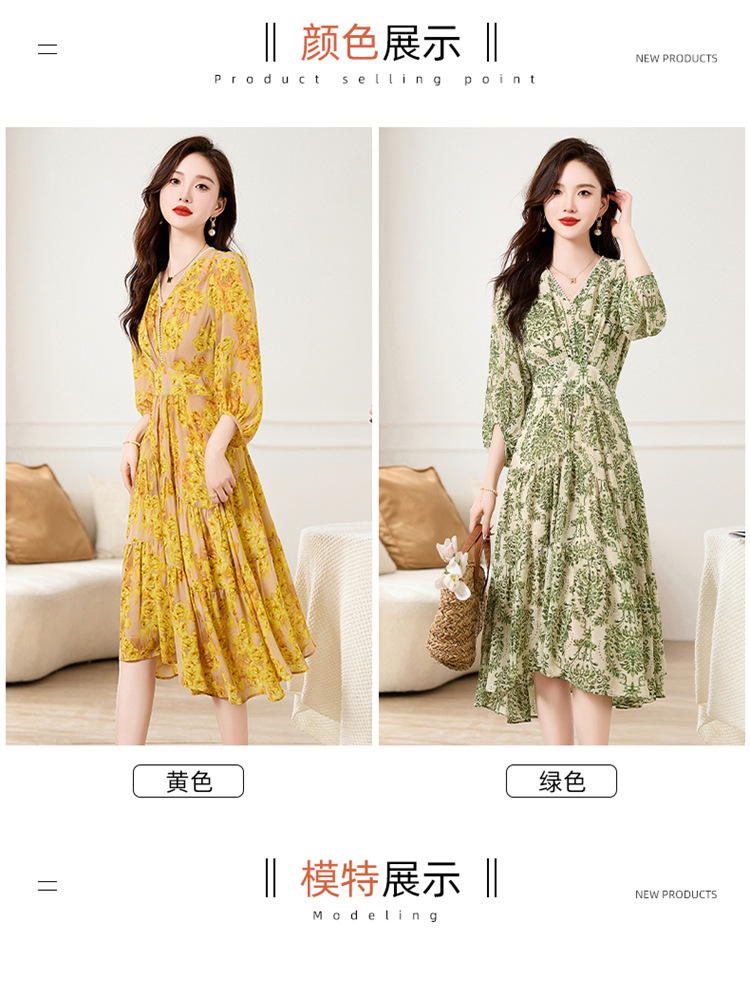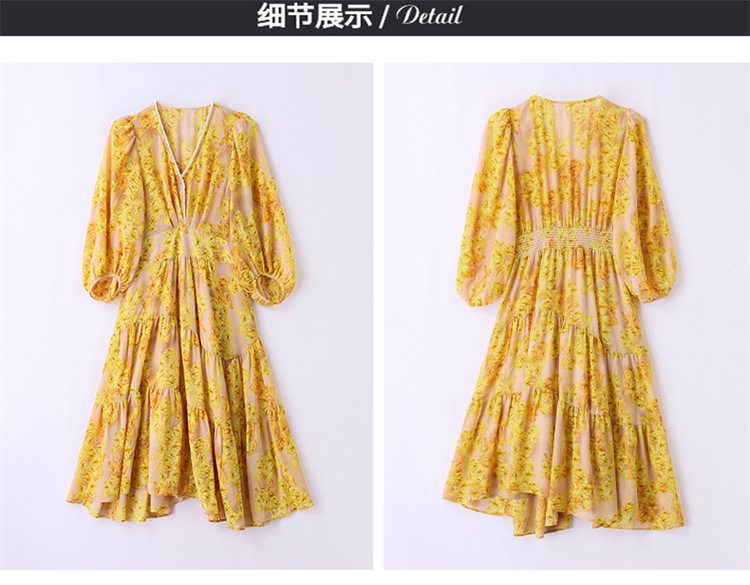 HR XXM619气质串珠V领印花连衣裙拼接显瘦不规则裙摆