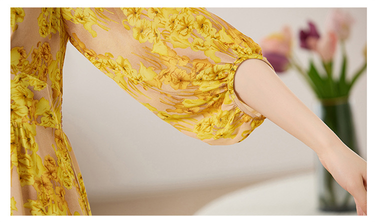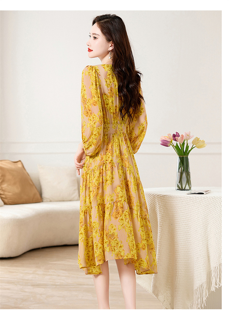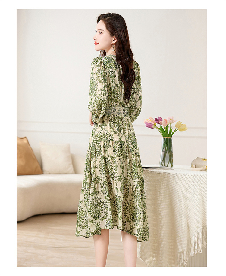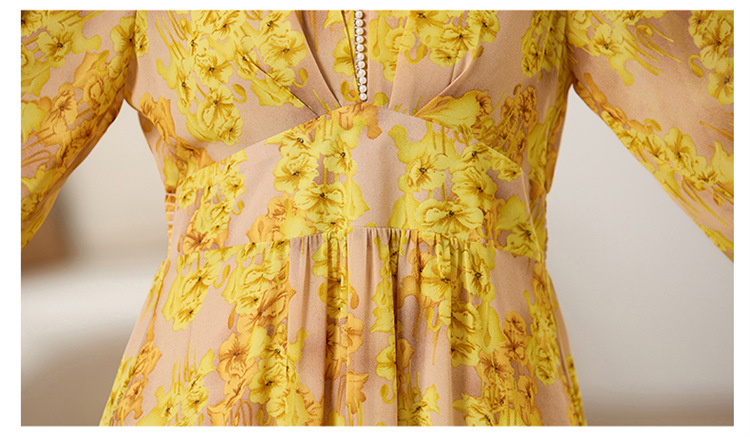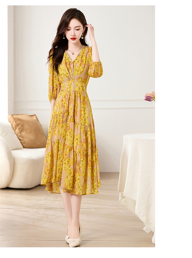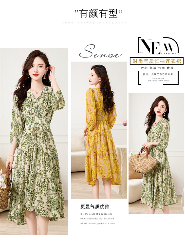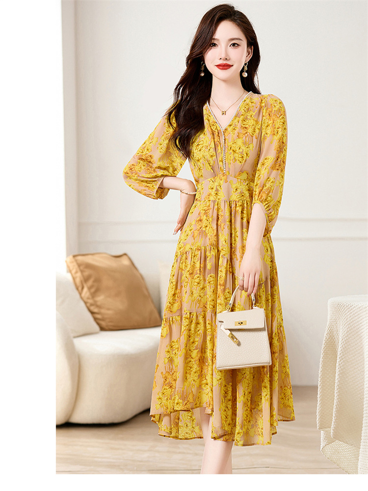 HR XXM619气质串珠V领印花连衣裙拼接显瘦不规则裙摆