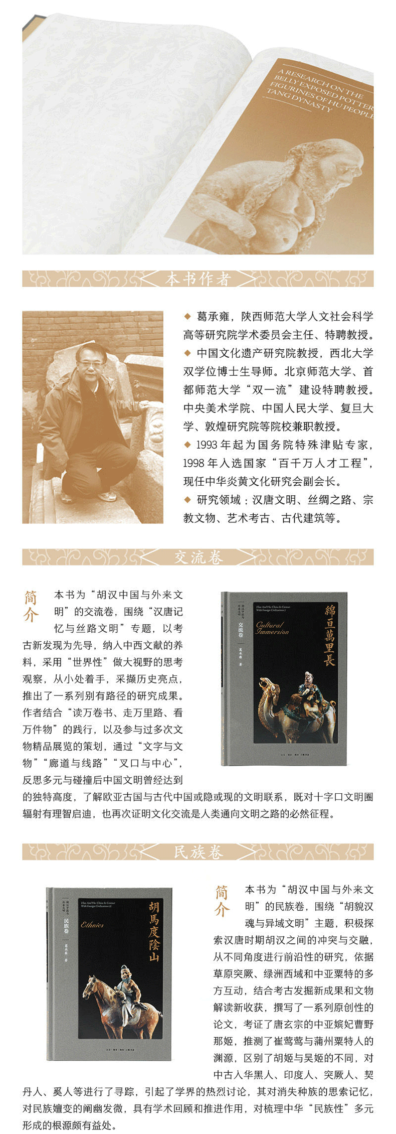 全书总书名为《胡汉中国与外来文明》,分为五卷,即《交流卷:绵亘万里长》《民族卷:胡马度阴山》《艺术卷:拂菻花乱彩》《宗教卷:番僧入华来》《胡俑卷:绿眼紫髯胡》。在书中,作者纵论胡汉文化如何在汉唐时期进行深入交流互动,具体考察了入华胡人的生活状况,探讨外来文明对中原建筑、书法、绘画、雕塑以及生活习俗等方面的影响,挖掘祆教、摩尼教、景教等在中原地区的传播。作者长期工作于考古文博的一线,亲身接触大量新出土但尚未刊布的考古文物及文献成果,在此基础上,作者撰写多篇文章并配以重要的图片,这些研究文章对于推动历史学、考古学的研究,对于建立中国学者与国际学术界的交流有着极其重要的意义。同时,作者关注的地域空间大多与汉唐以来丝路沿线的族群、政权相关联,对于这些地区的历史、文化、宗教、艺术的基础性研究,对于扎实推进“一带一路”构想有着积极作用。