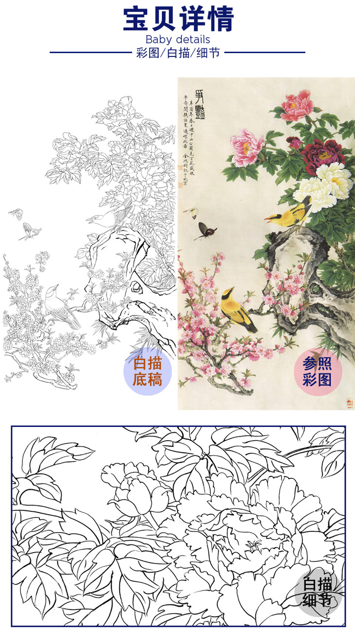 竖幅工笔花鸟白描底稿-金鸿钧-牡丹《争艳》-多种白描尺寸可选-A113