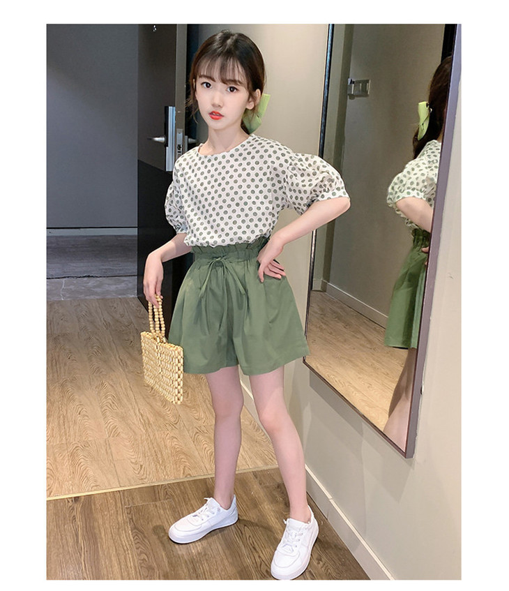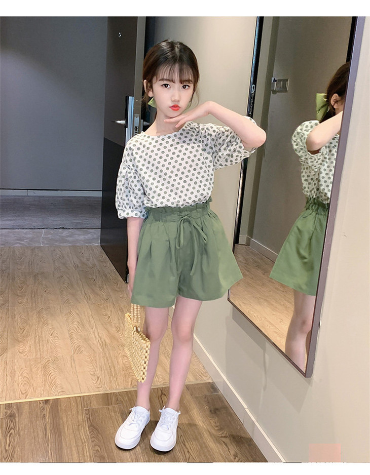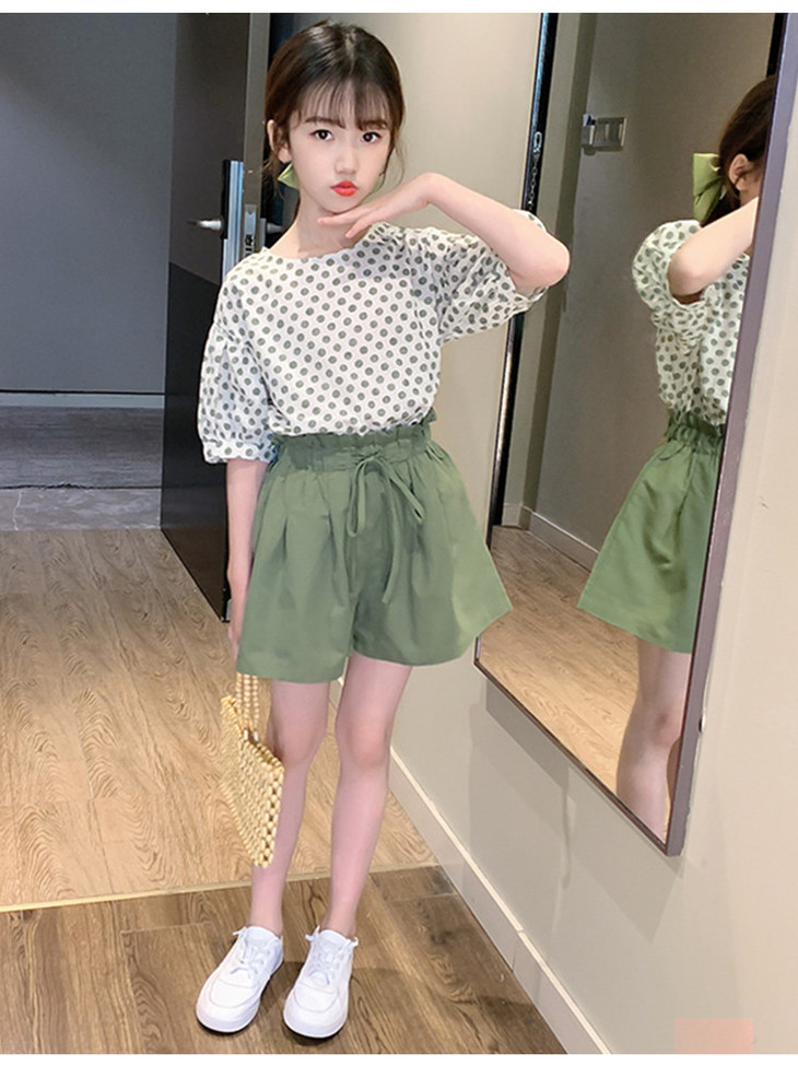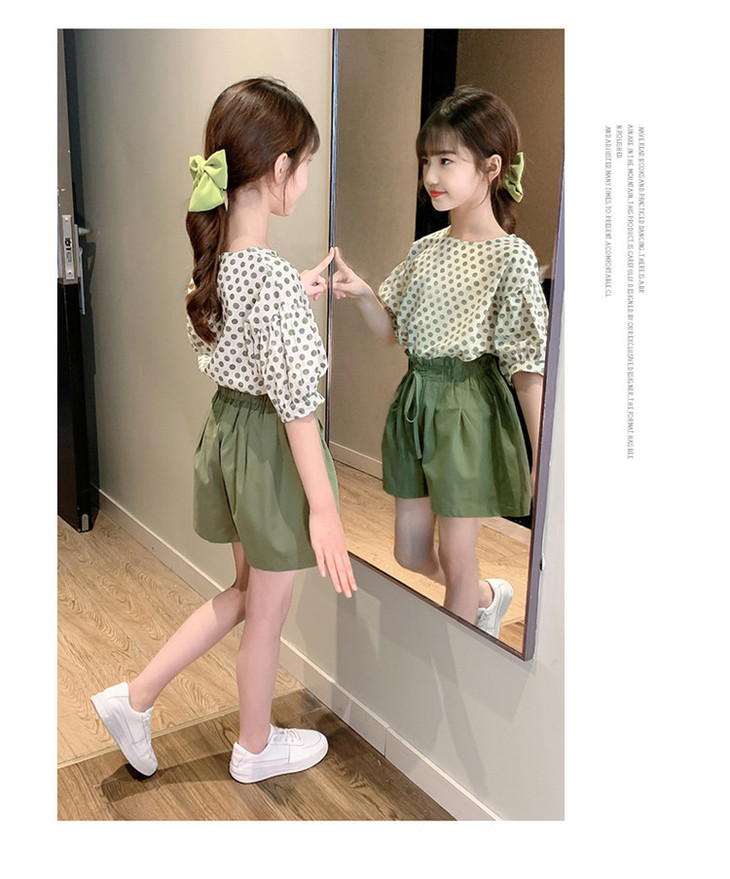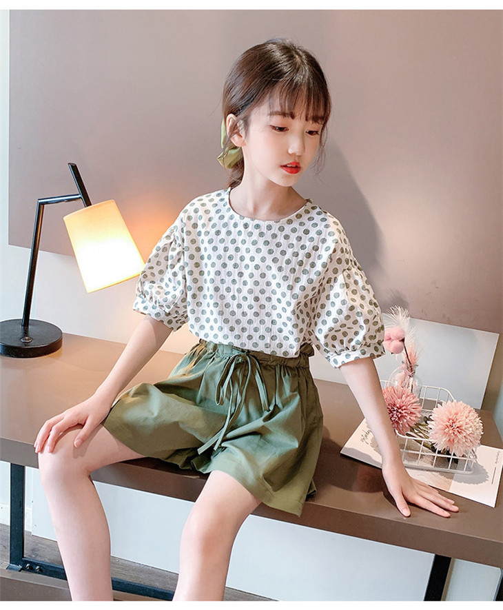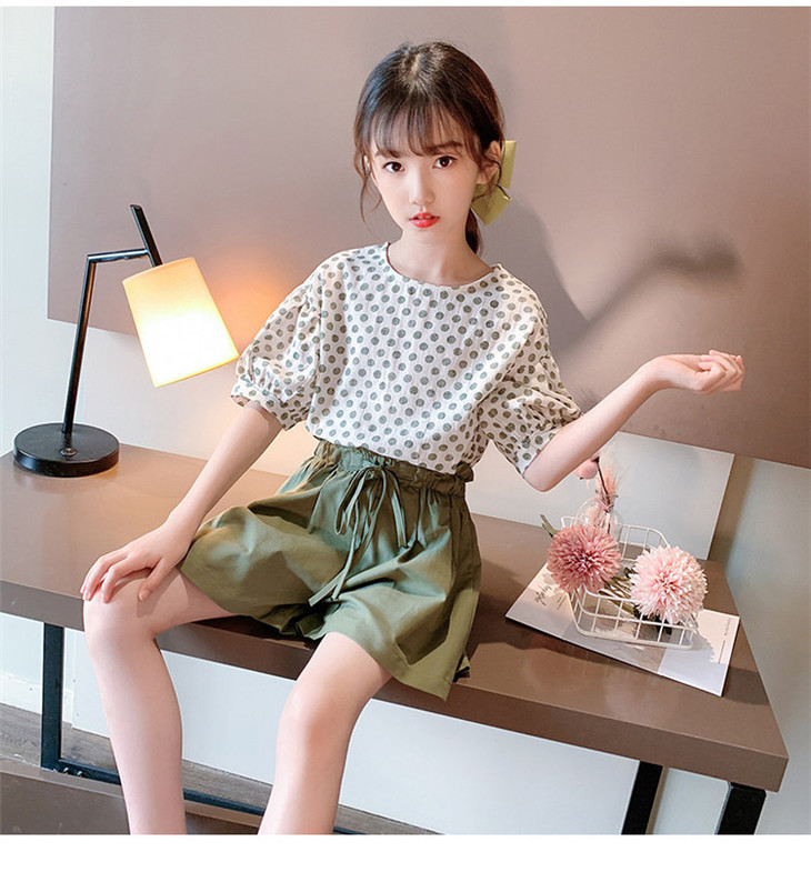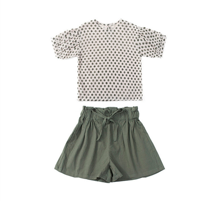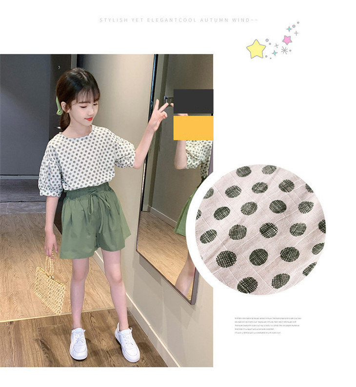MTFZ新款女童时尚洋气棉麻波点短袖上衣短裤两件套