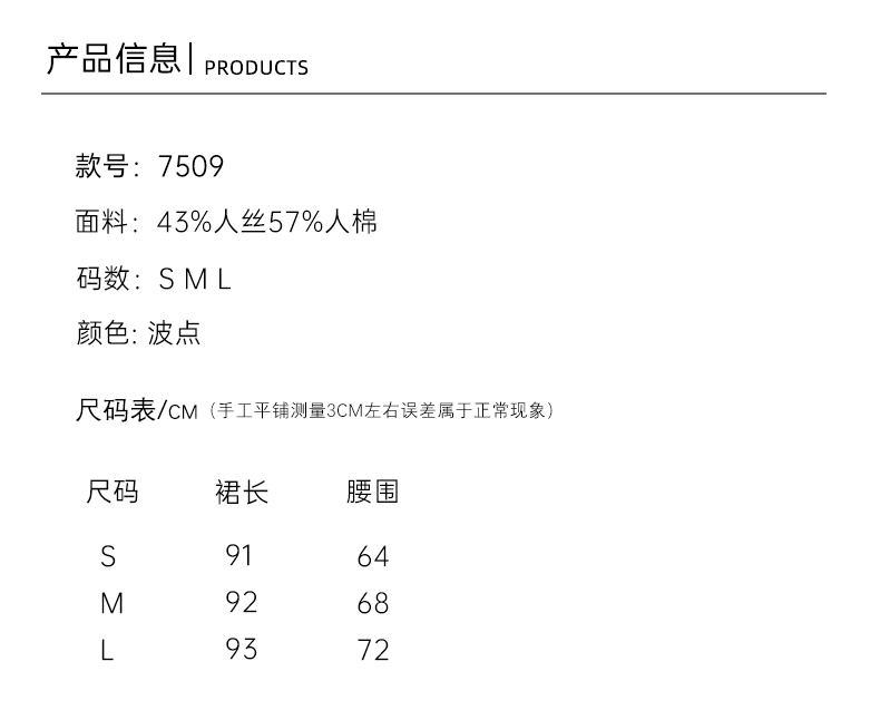 【波点长款鱼尾人丝半裙】25早秋人丝混棉度假休闲风半身裙女7509(货号:24sy7509bq)
