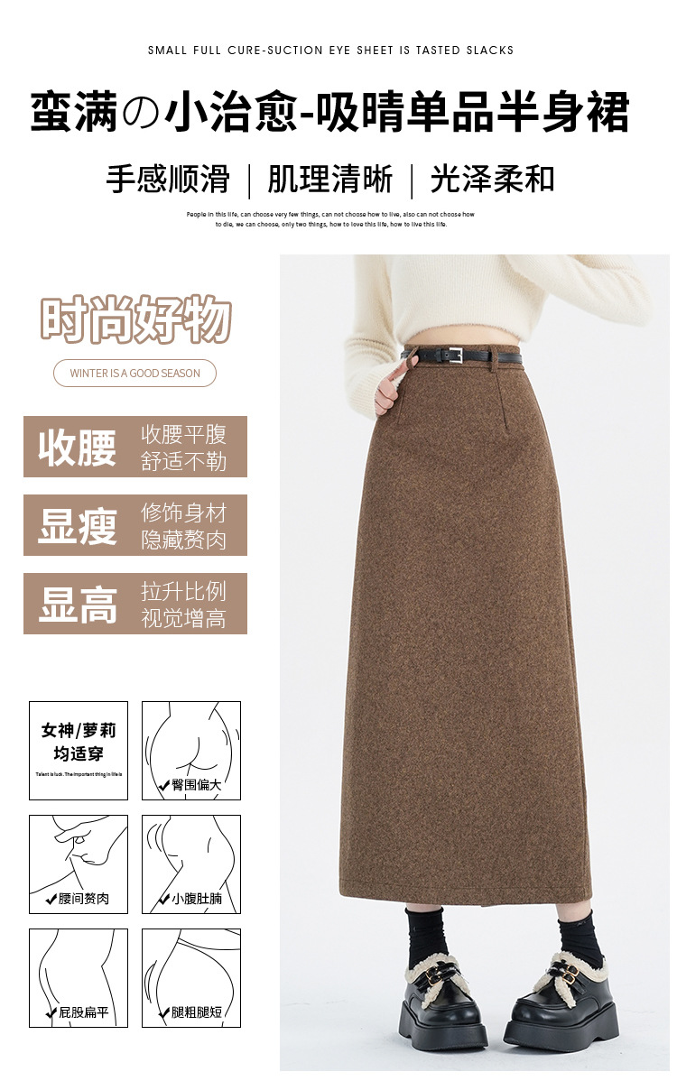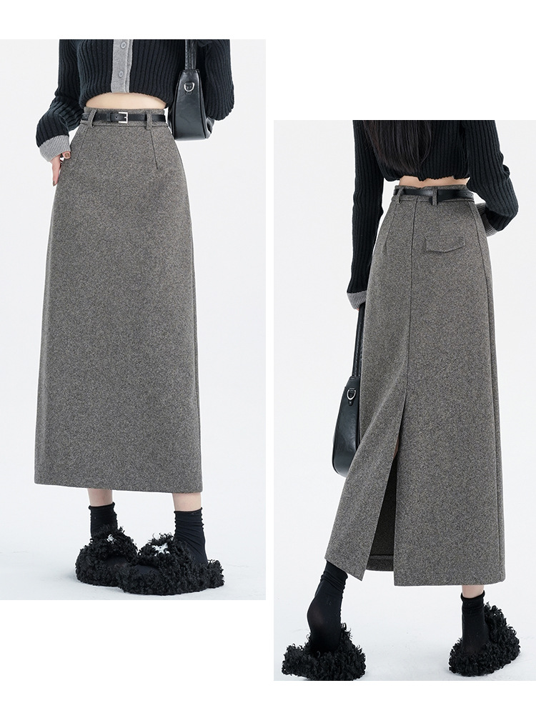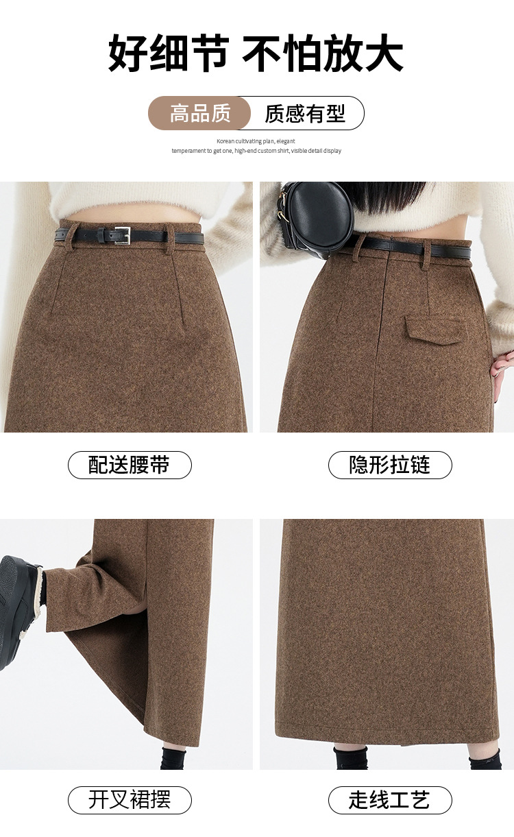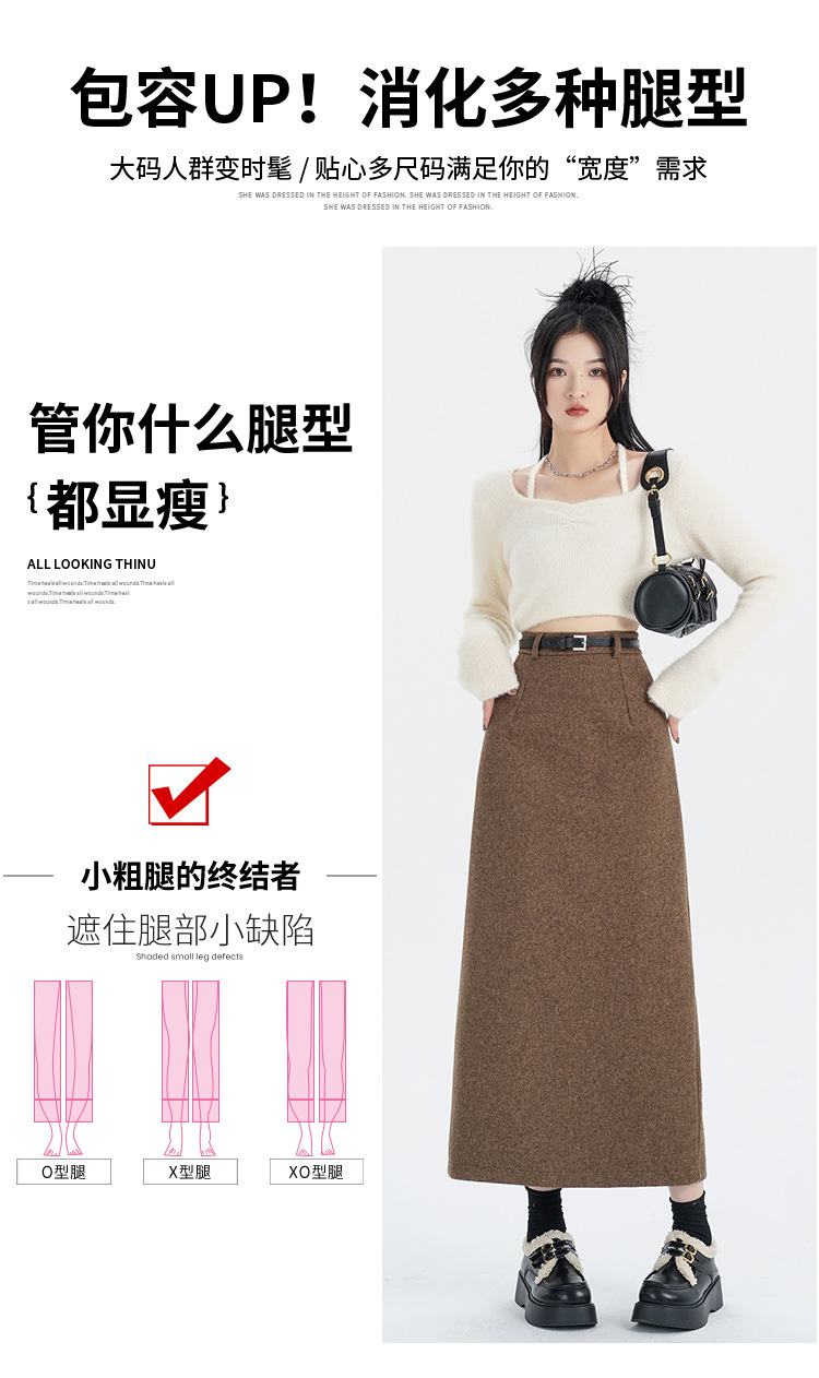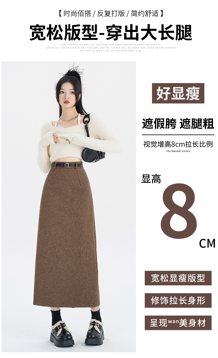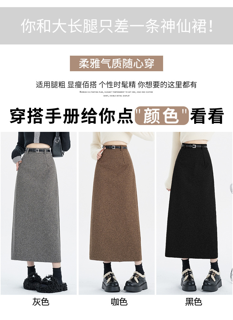 KQL 435H8126休闲半身裙开叉高腰西装毛呢裙