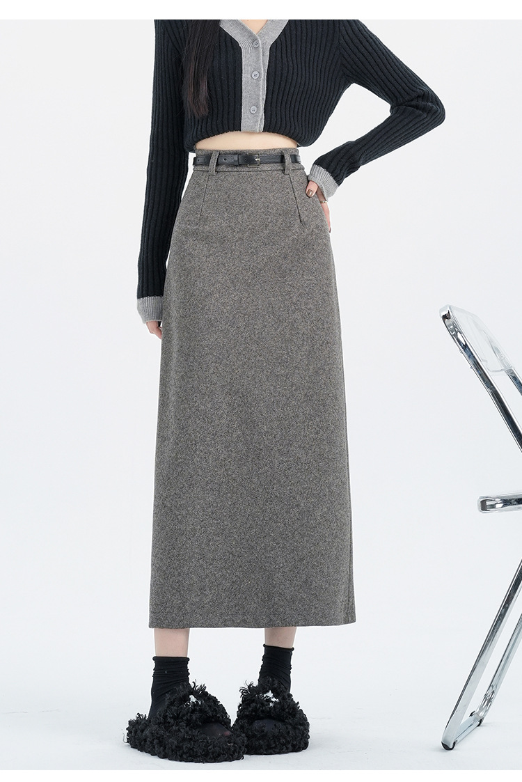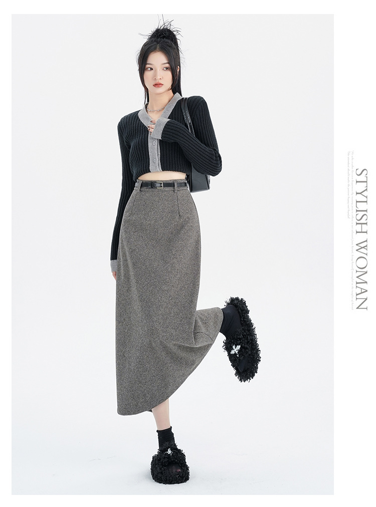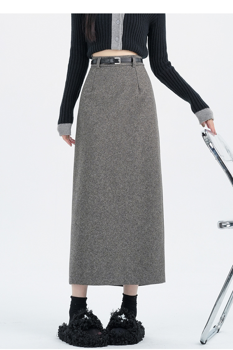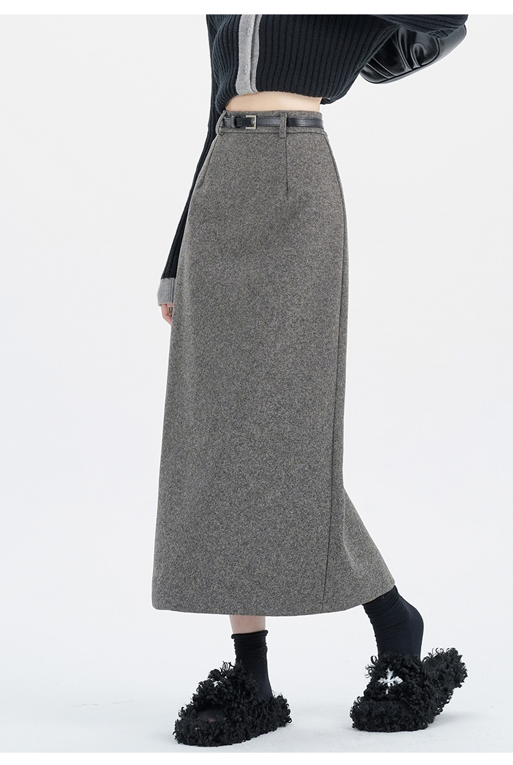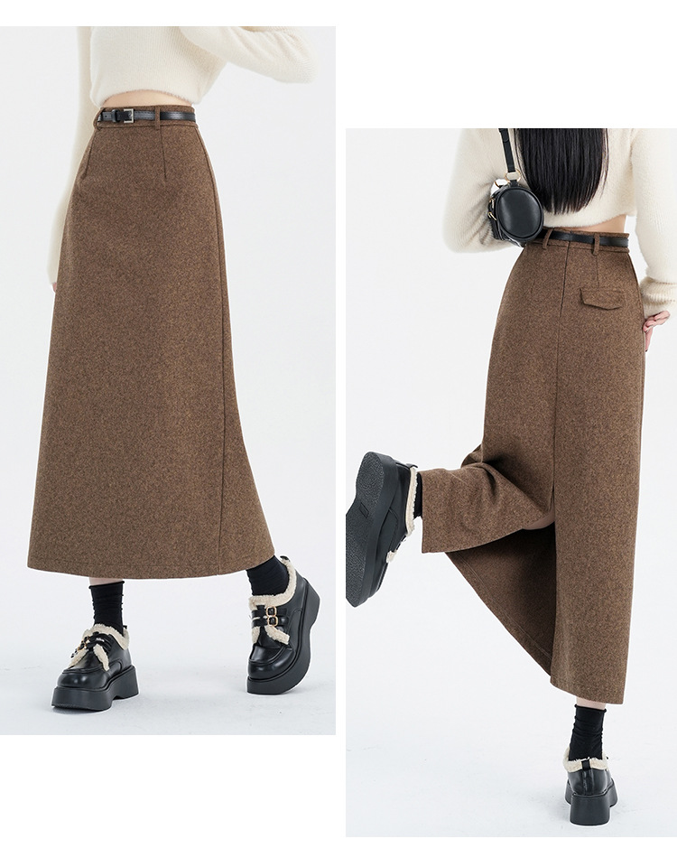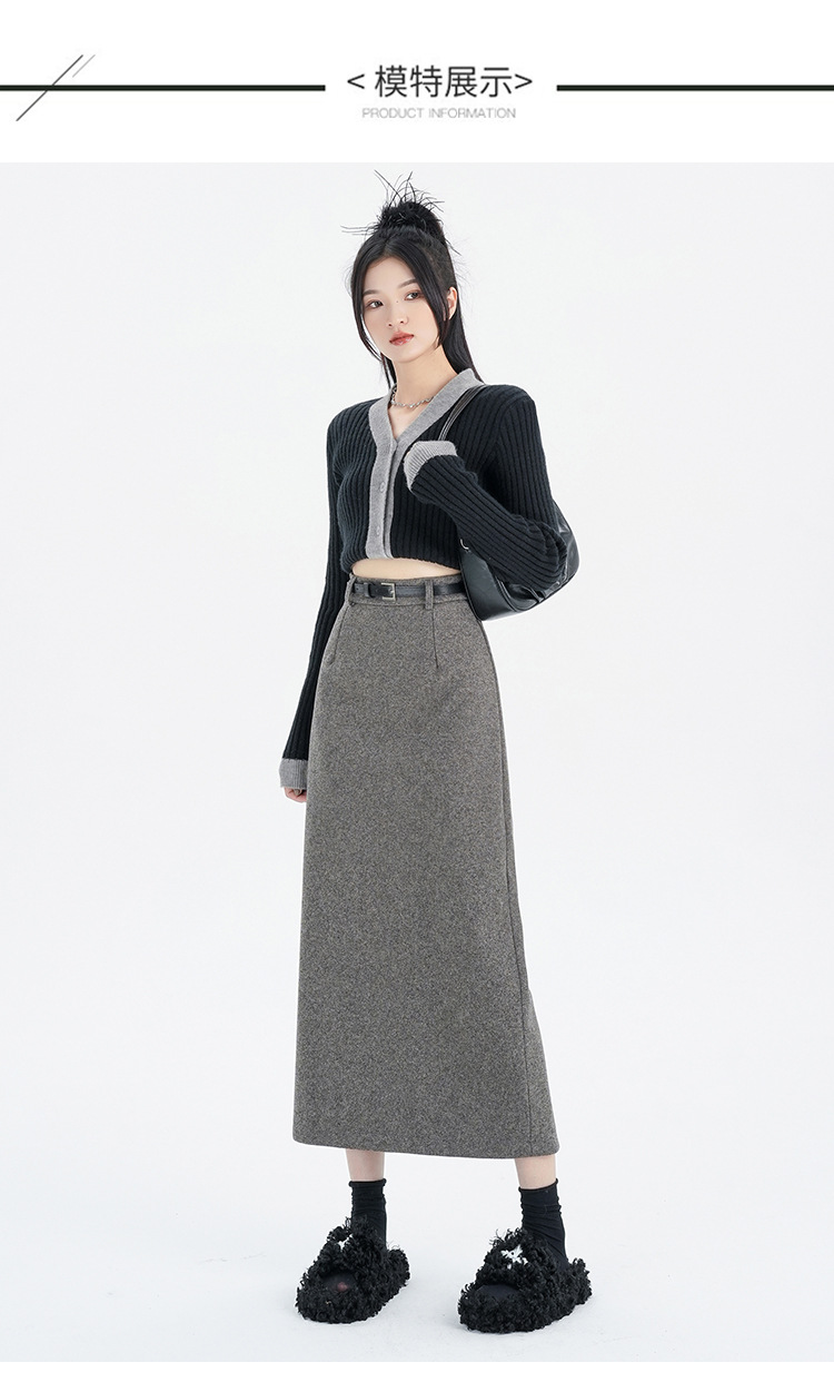 KQL 435H8126休闲半身裙开叉高腰西装毛呢裙