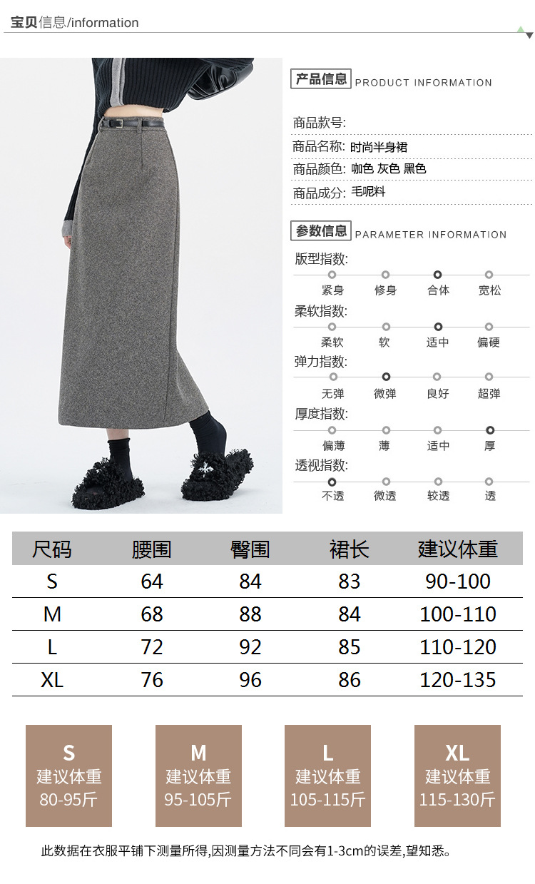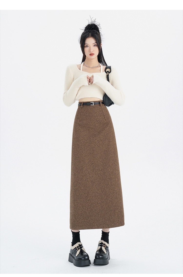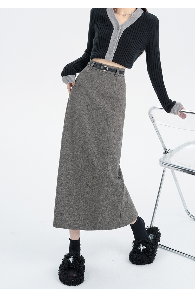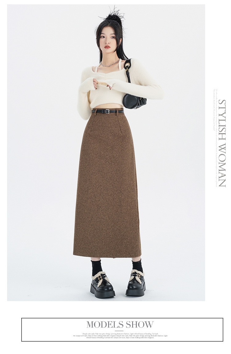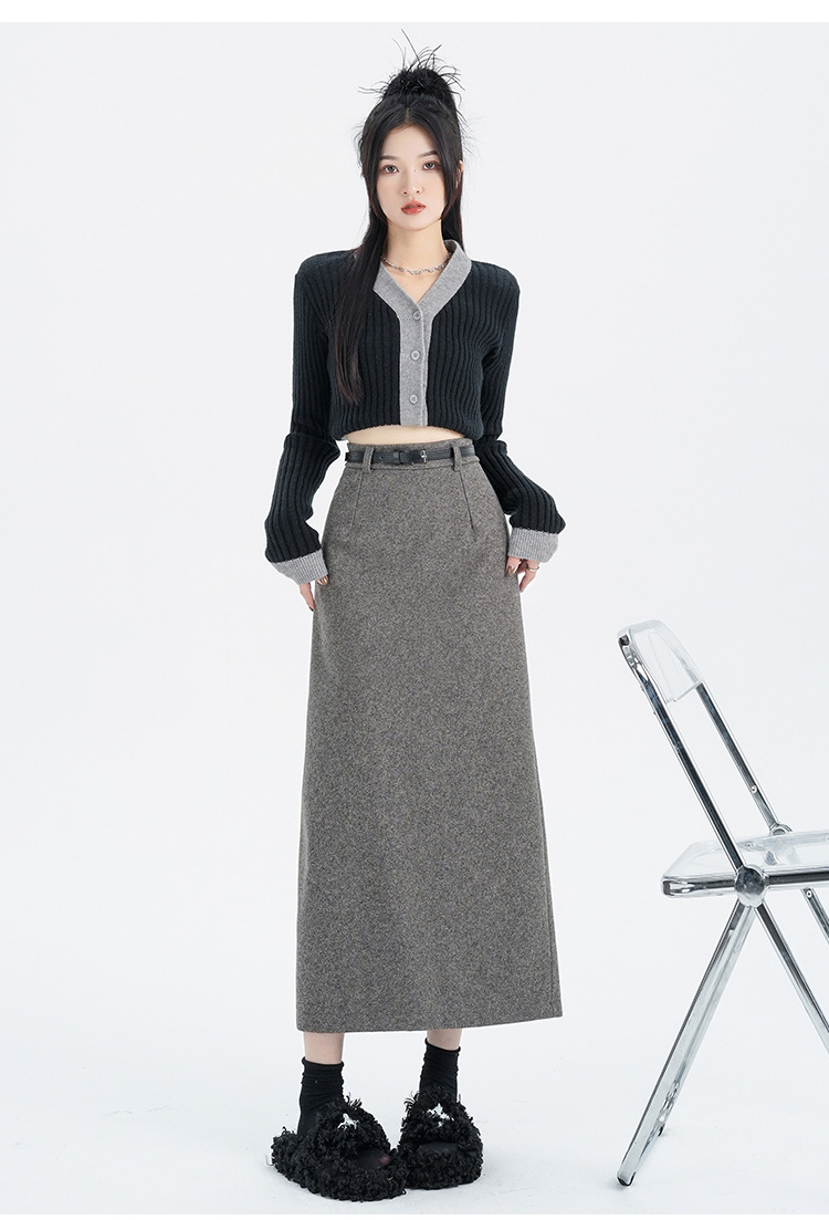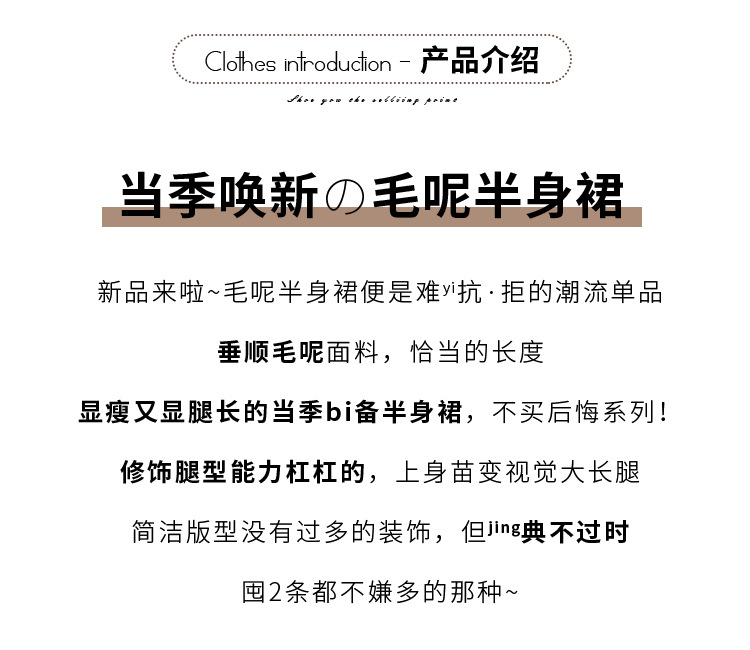 KQL 435H8126休闲半身裙开叉高腰西装毛呢裙