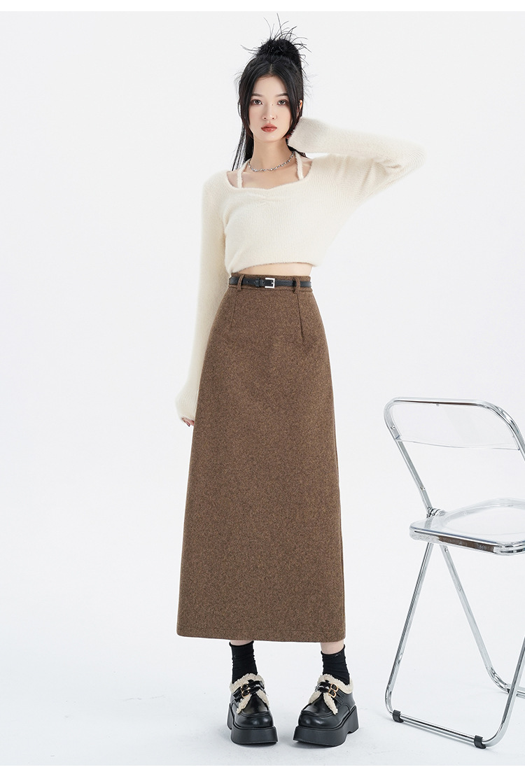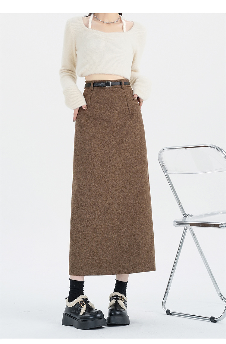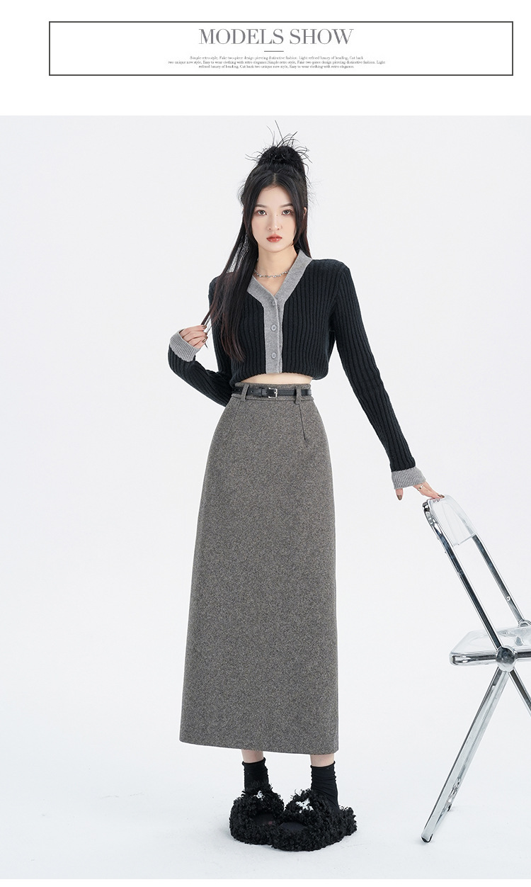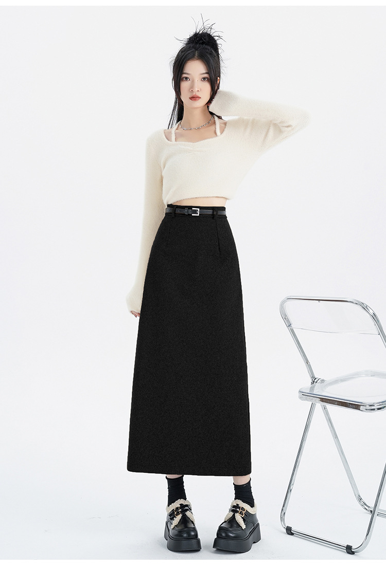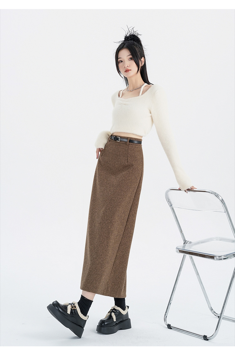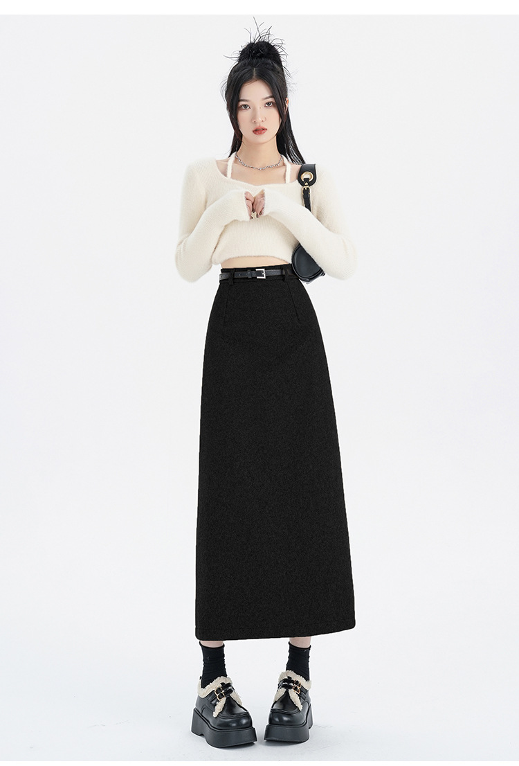 KQL 435H8126休闲半身裙开叉高腰西装毛呢裙