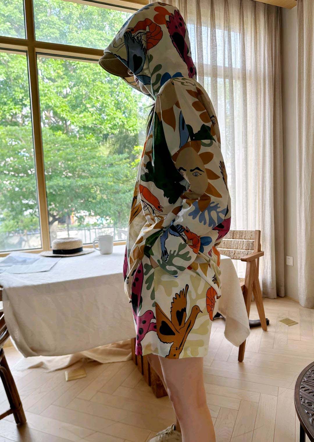 上衣还带连帽,可以很好的遮阳挡风