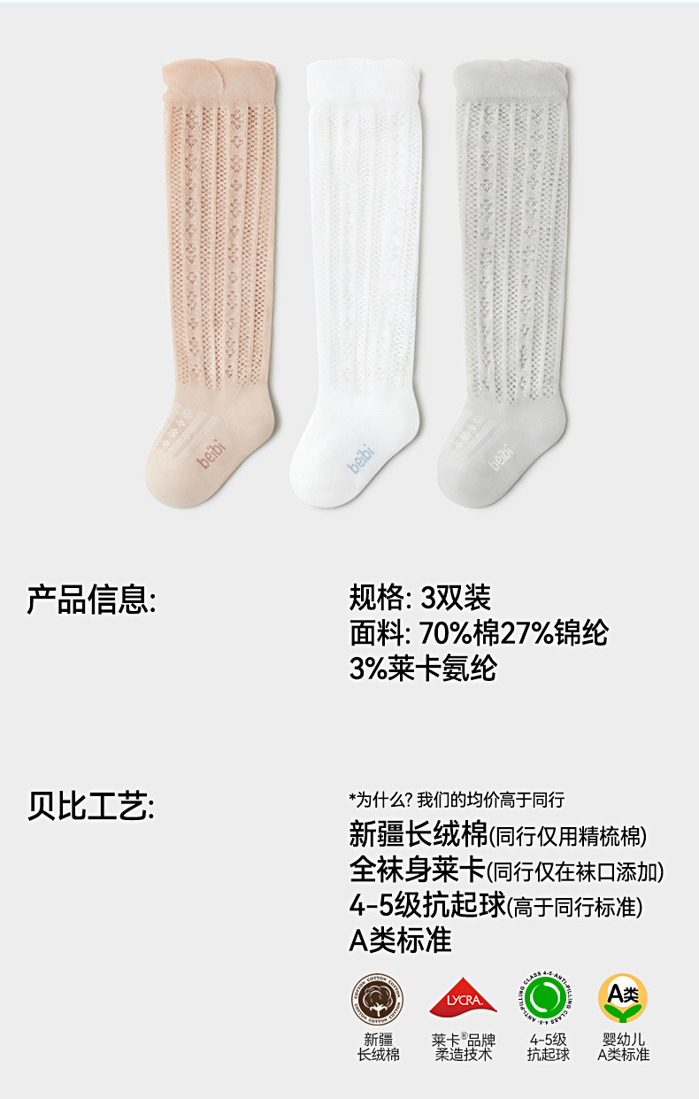 【一体机 无骨袜头 不勒腿的喷泉袜】贝比童袜 儿童袜子 夏季薄款过膝防蚊袜 超薄宝宝 袜子网眼婴儿长筒袜-QQ