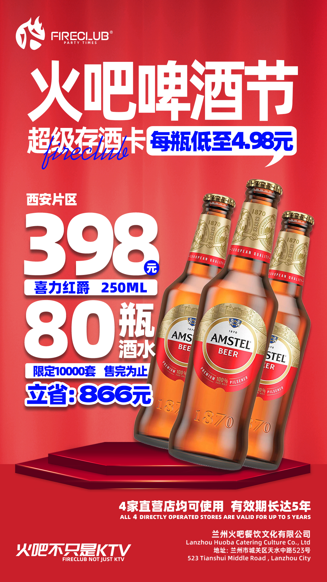 【西安通用】118火吧啤酒节—超值存酒卡—398元80瓶喜力红爵250ml