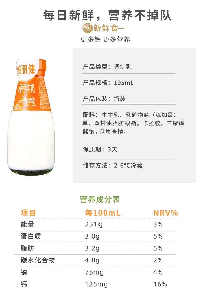 【3天后到店自提】美丽健鲜之道瓶装高钙巴氏鲜牛奶195mL