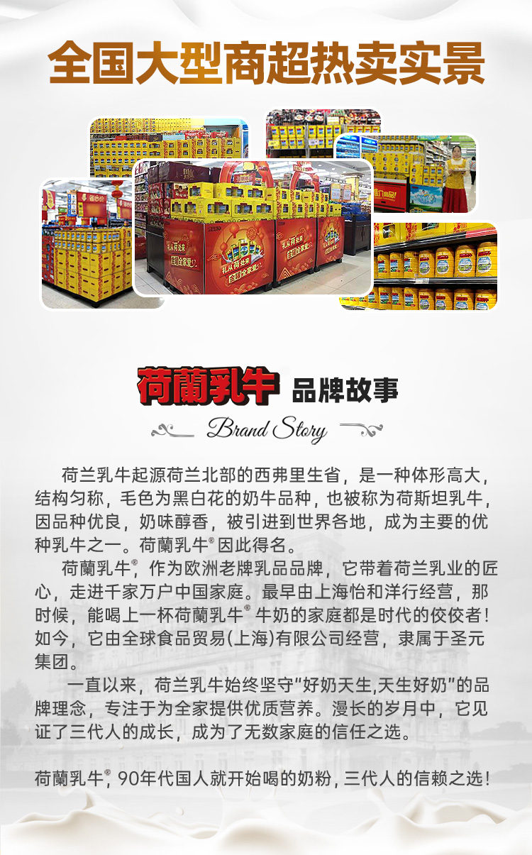 - 荷兰乳牛品牌于1990年进入中国,相伴31年始终致力于为更多家庭奉上优种荷兰乳牛带来的营养与美味。秉承“珍选至纯营养,传承经典醇香”的理念,打造一个覆盖全人群、多品类、高品质的国际化品牌。