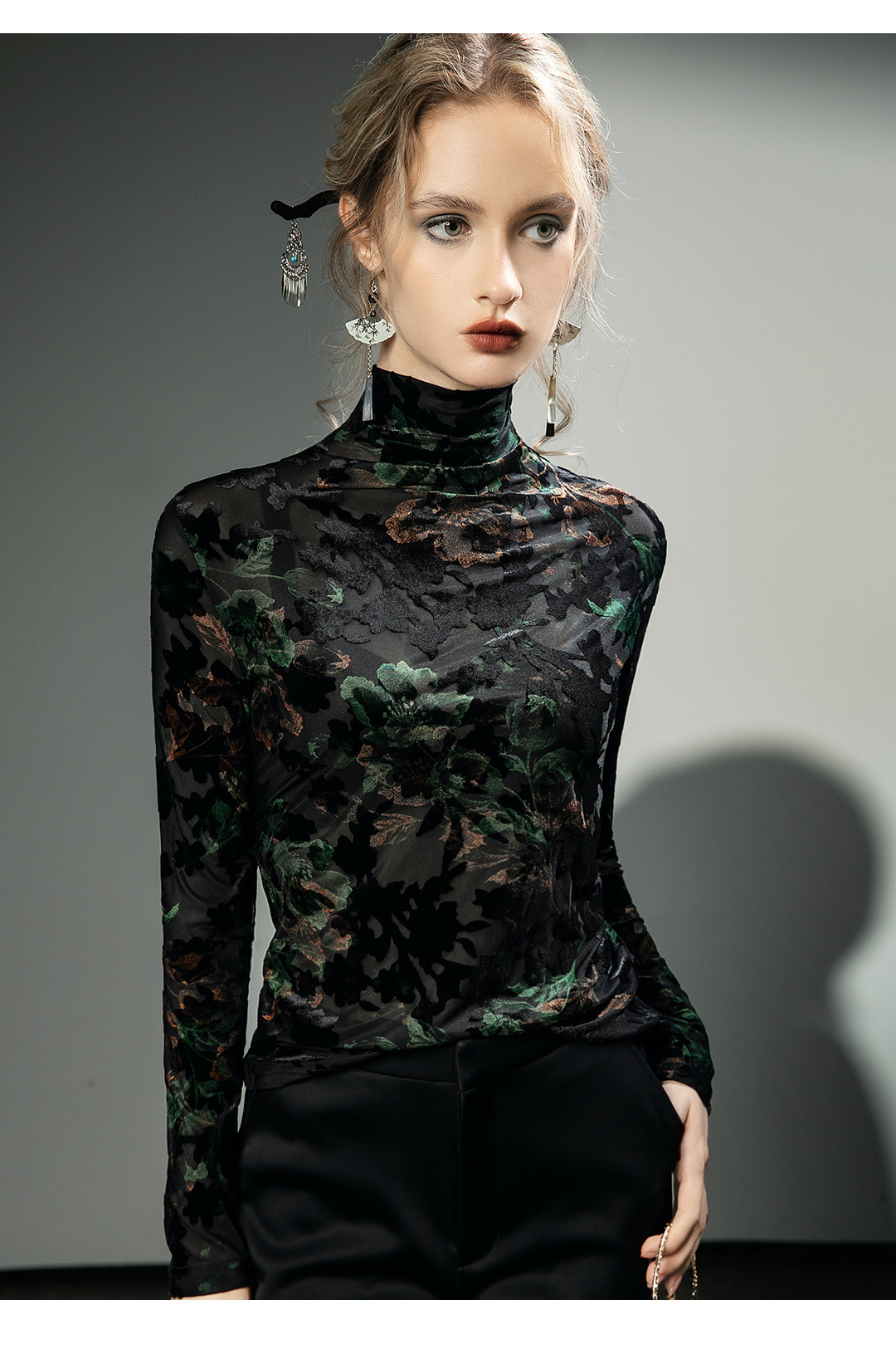 F20245311国风刺绣提花长袖秋冬新款气质打底上衣弹力修身新中式高领小衫 商品图0
