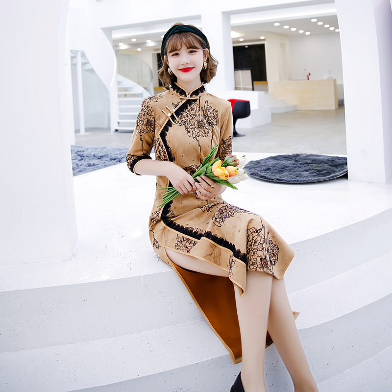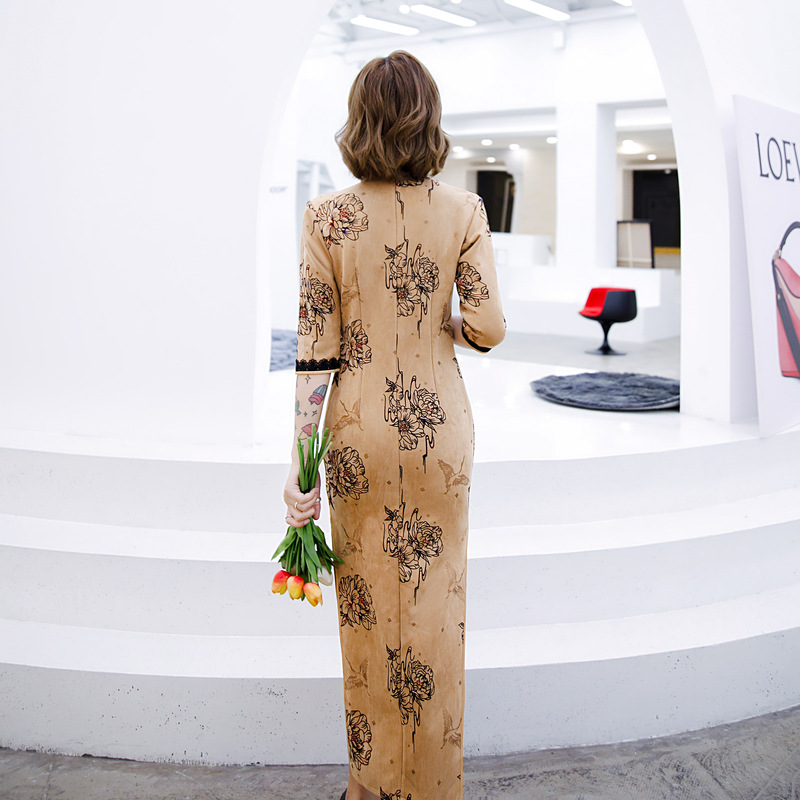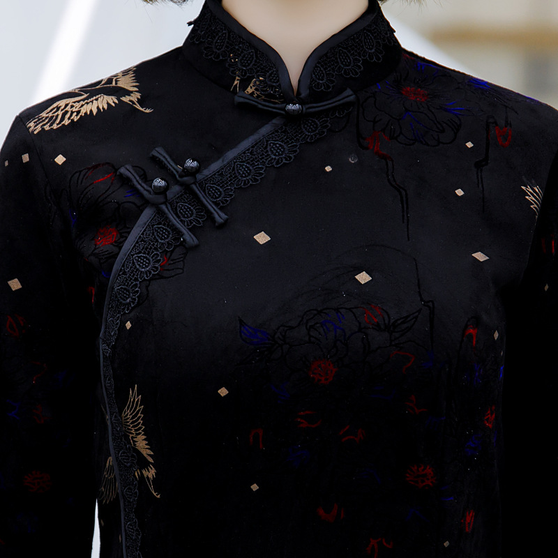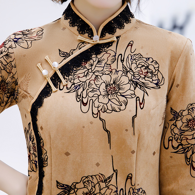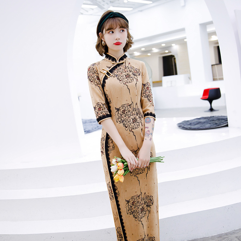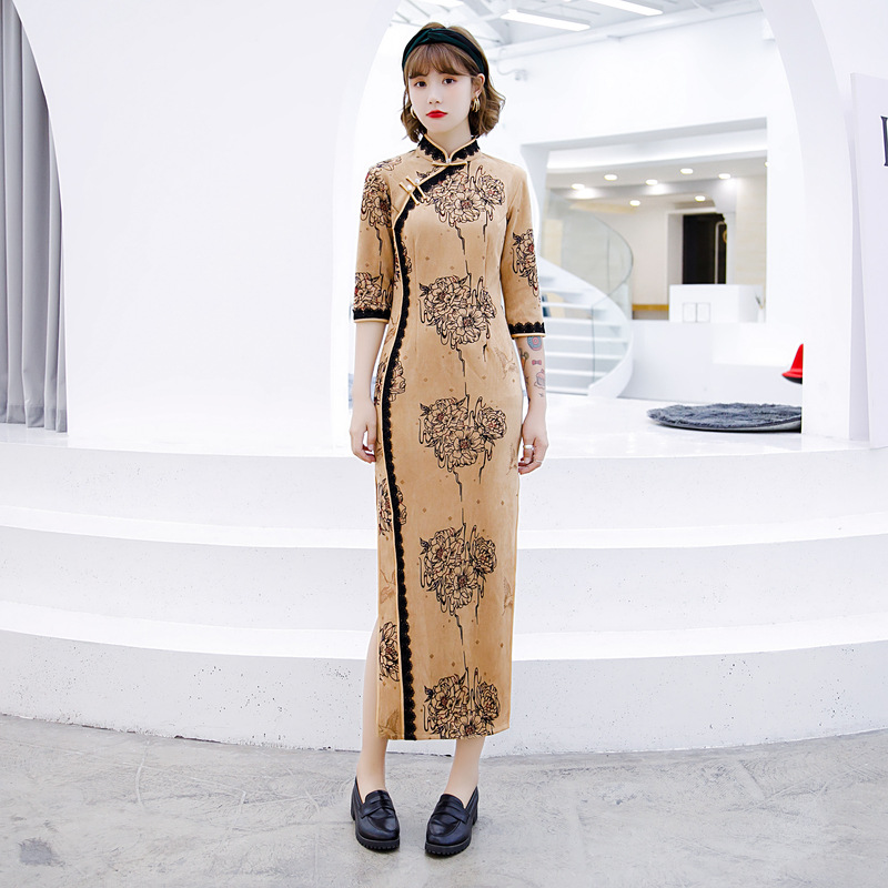 ZAYS-529新款秋冬麂皮绒蕾丝边长旗袍日常演出走秀大码七分袖改良旗袍