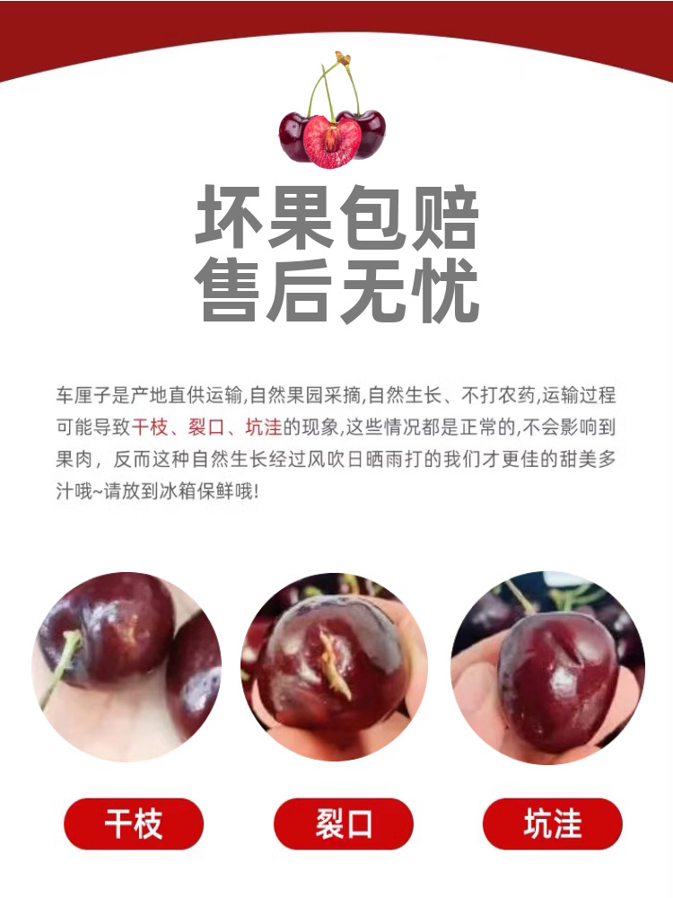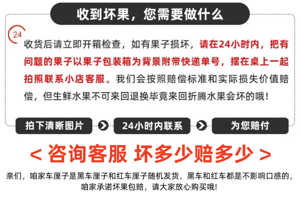 【关于售后】不支持七天无理由退换货,收到有坏果请在签收后24小时内,把有问题的果子以果子包装箱为背景附带快递单号,摆在桌上一起拍照联系客服,超时不予赔付
