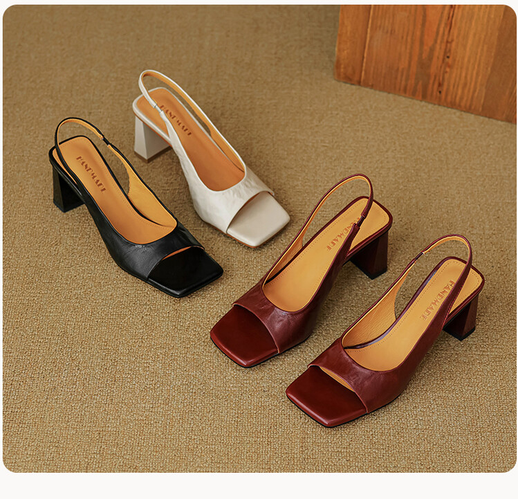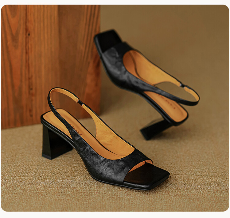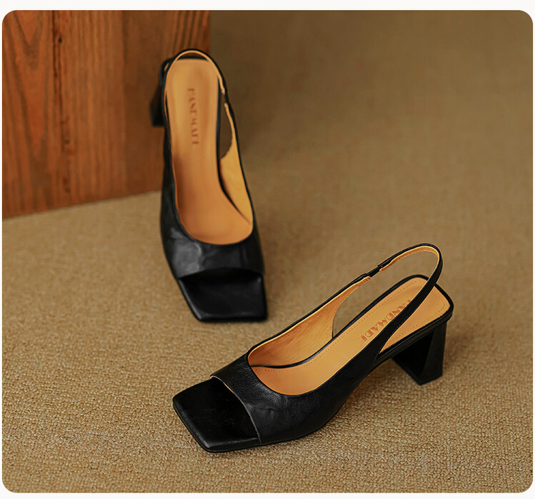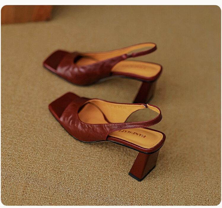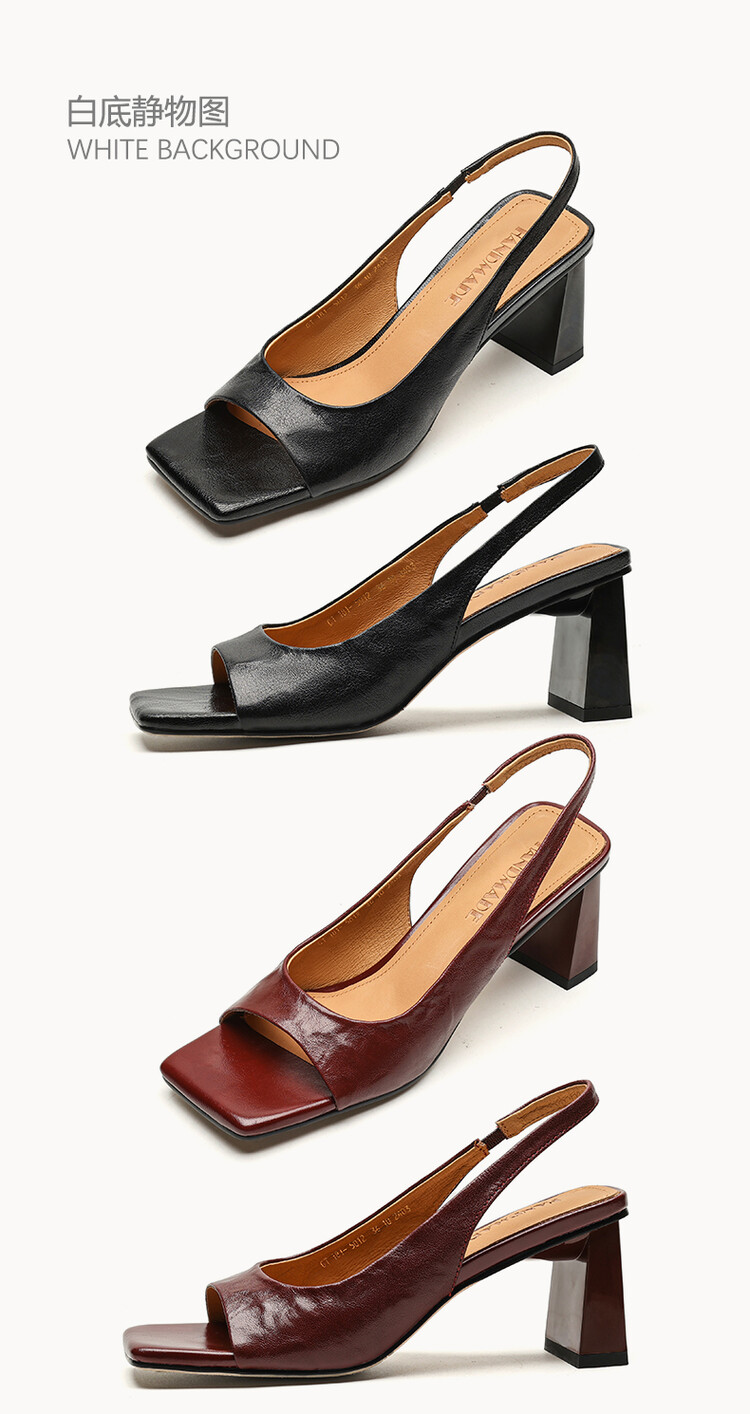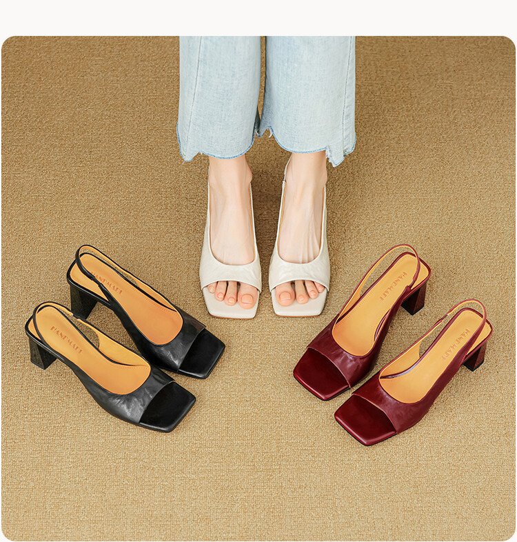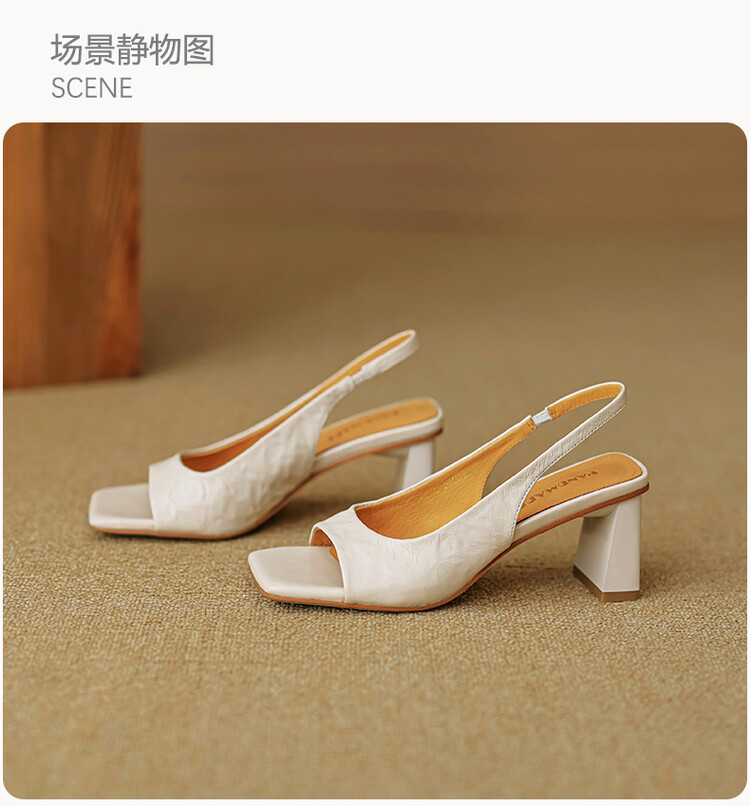 【预售5天】简约法式鱼嘴凉鞋女新款方头露趾一字式粗跟手抓纹羊皮高跟鞋HB&5012