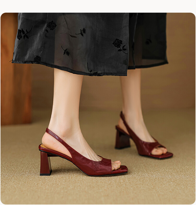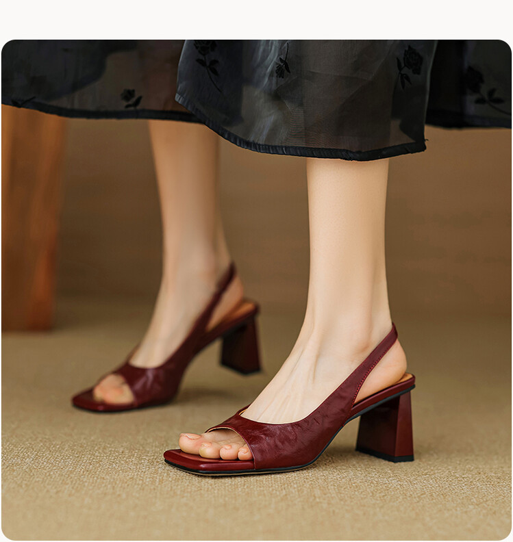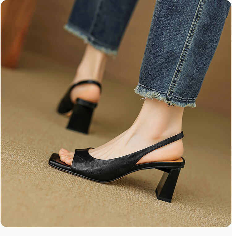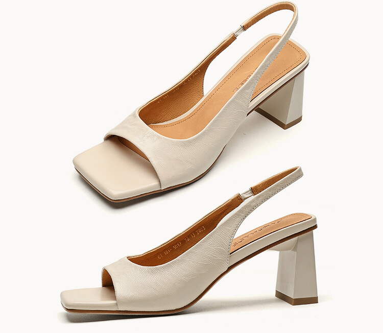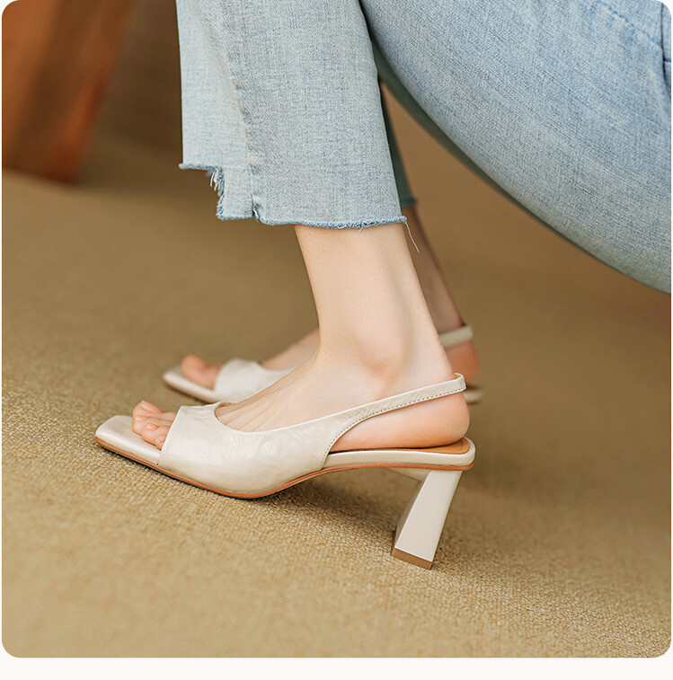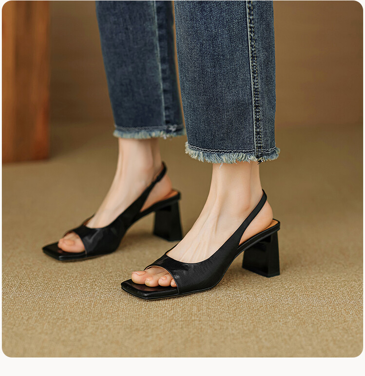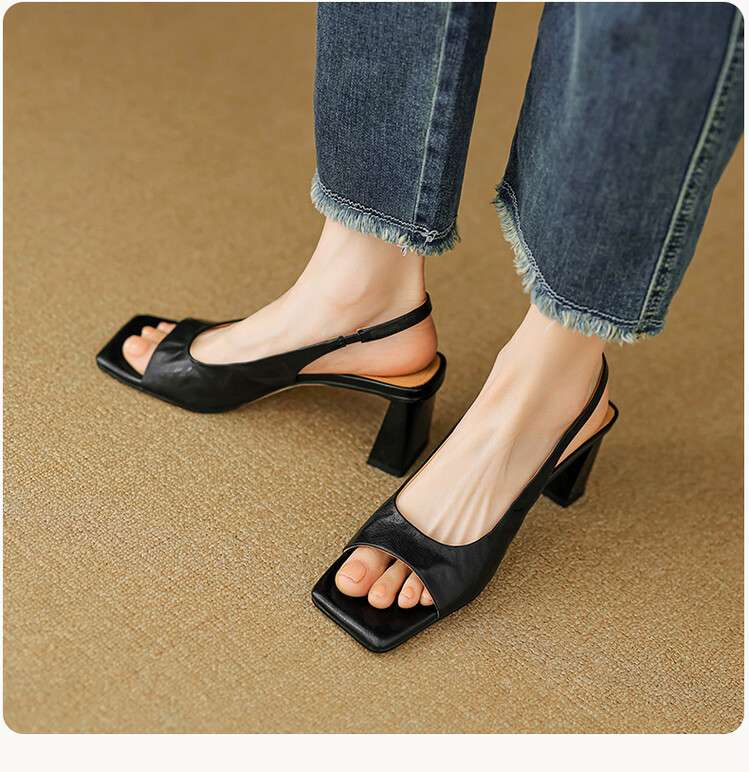 【预售5天】简约法式鱼嘴凉鞋女新款方头露趾一字式粗跟手抓纹羊皮高跟鞋HB&5012