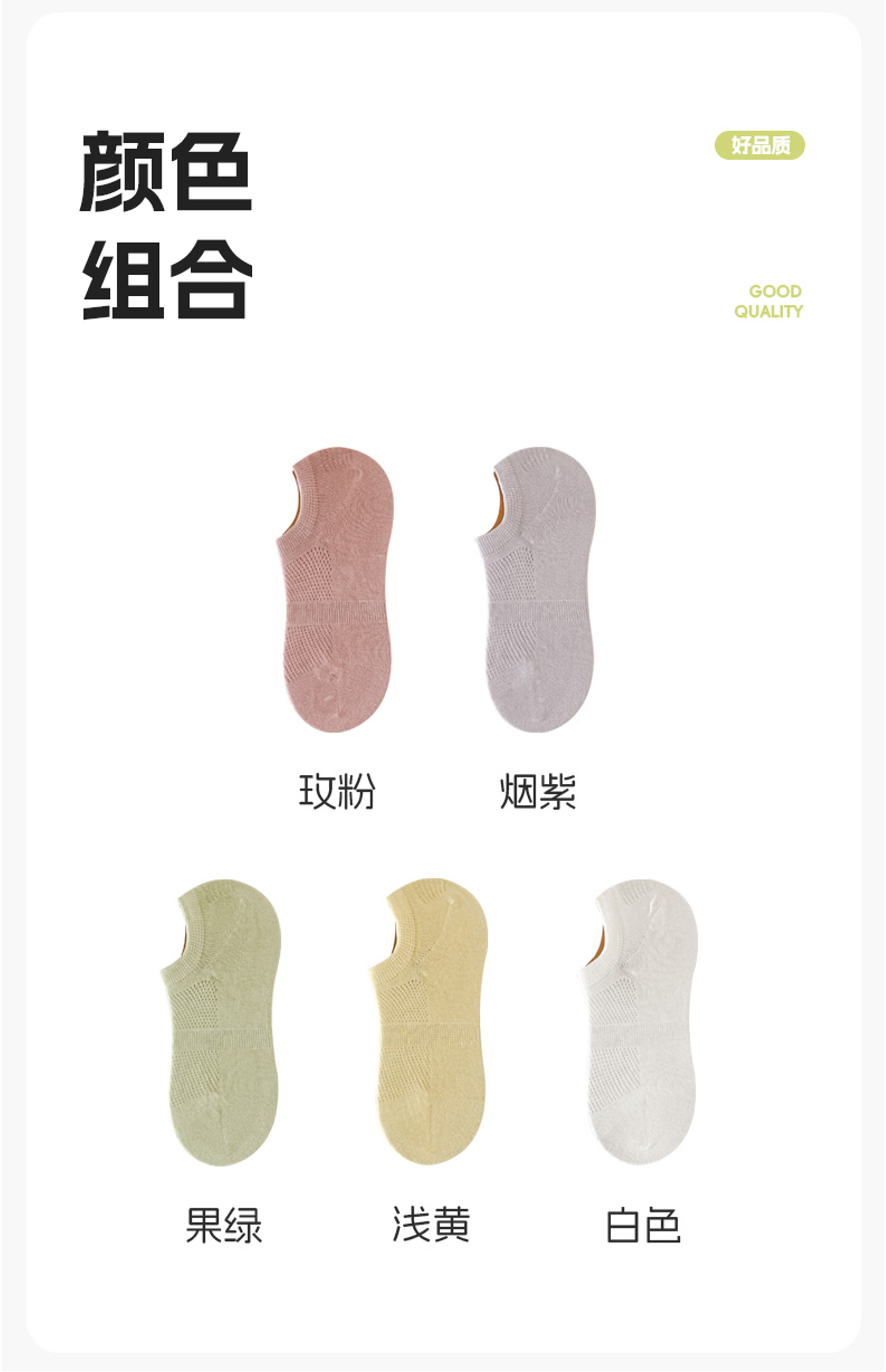 女款船袜:浅黄、烟紫、玫粉、白色、果绿