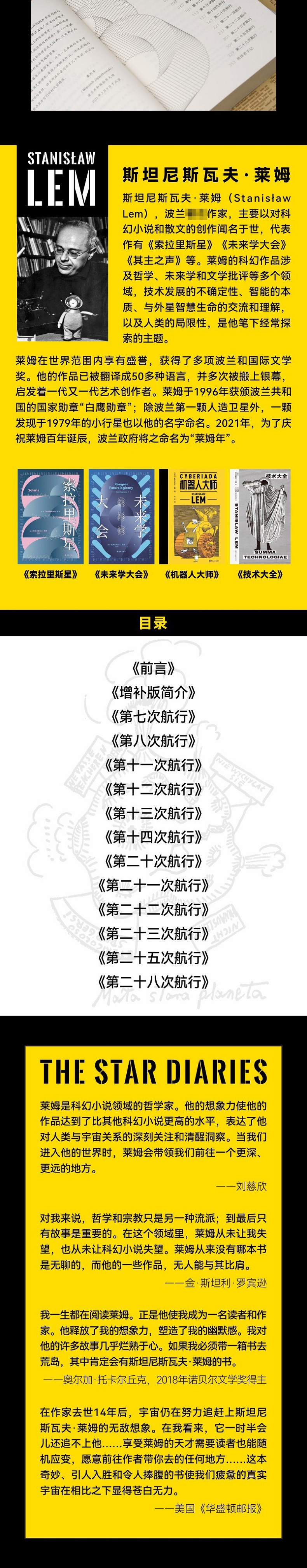 斯坦尼斯瓦夫·莱姆(Stanisław Lem),波兰作家,主要以对科幻小说和散文的创作闻名于世,代表作有《索拉里斯星》《未来学大会》《其主之声》等。莱姆的科幻作品涉及哲学、未来学和文学批评等多个领域,技术发展的不确定性、智能的本质、与外星智慧生命的交流和理解,以及人类的局限性,是他笔下经常探索的主题。
