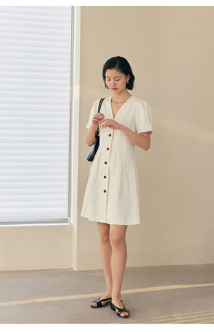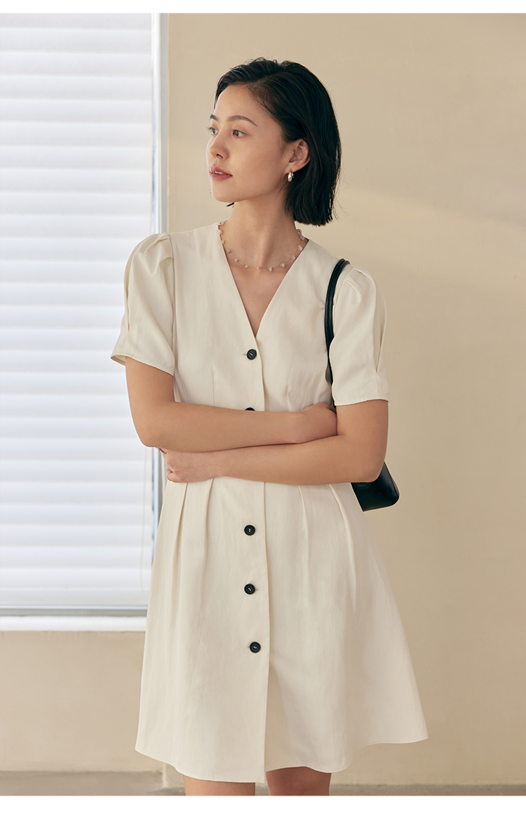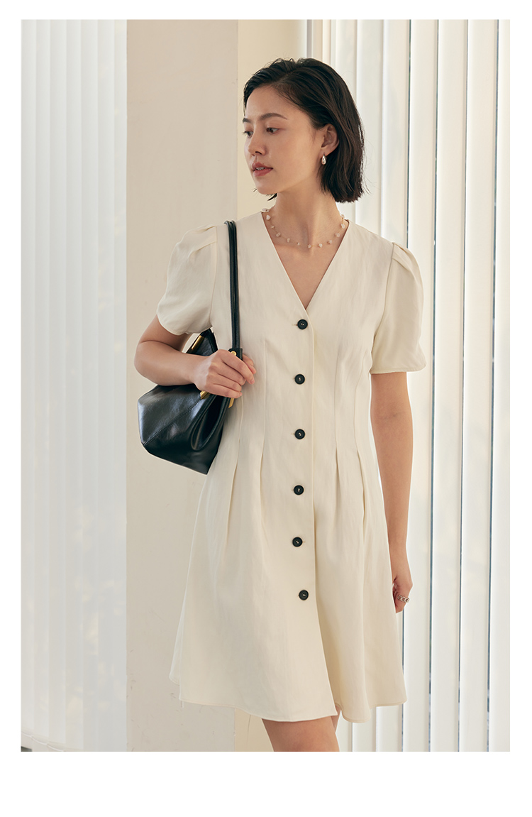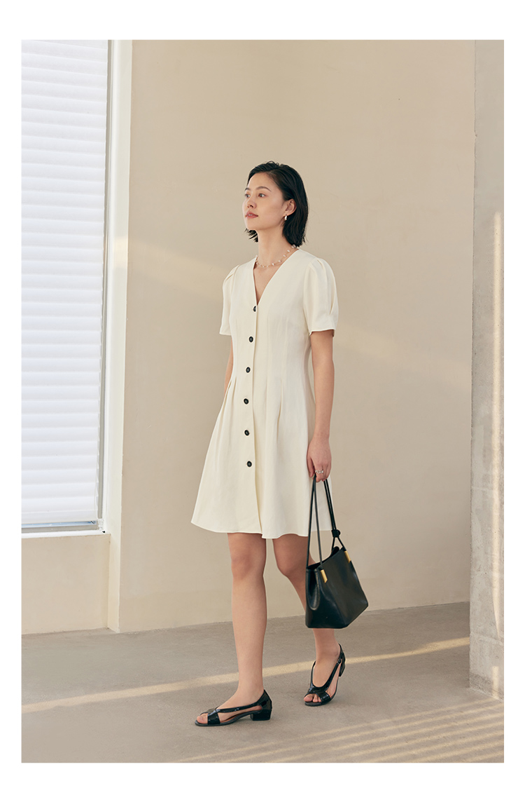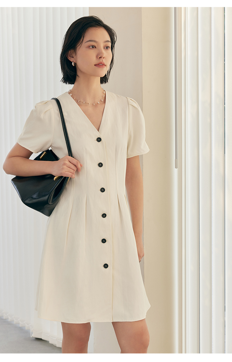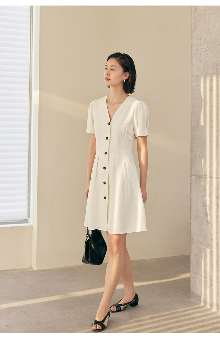 HeyDress白色连衣裙女夏季法式V领收腰设计感通勤气质短款A字裙子