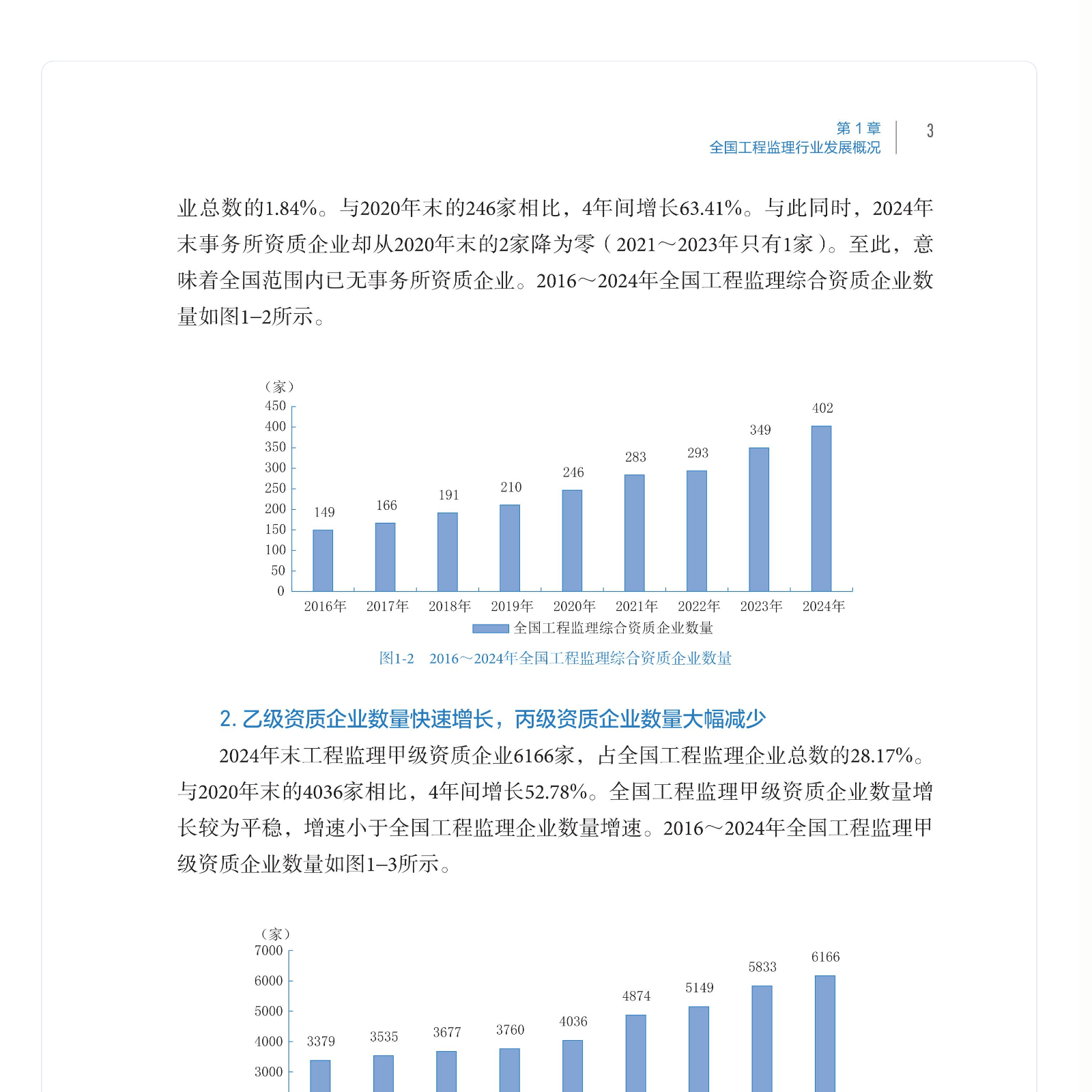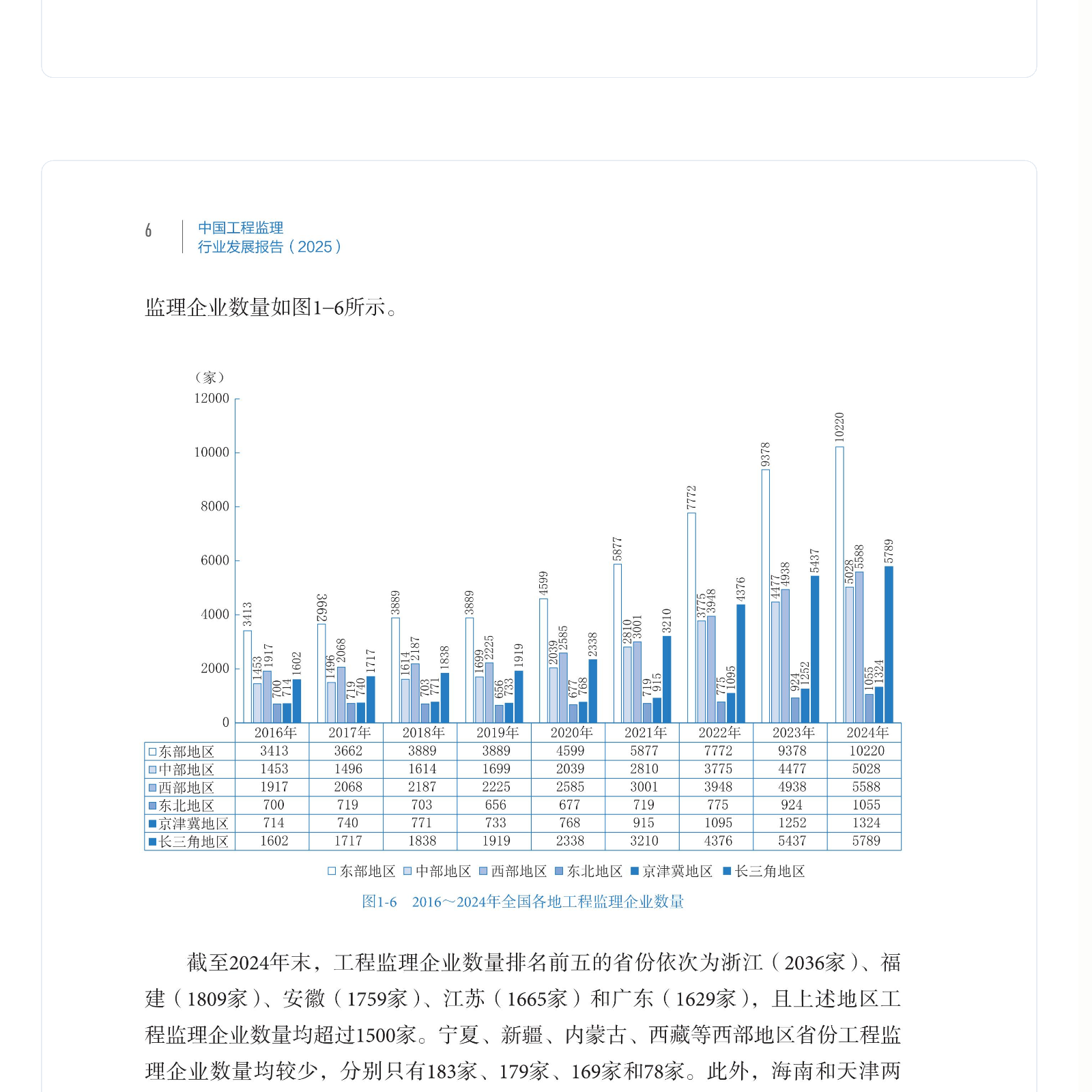 为全面反映工程监理行业发展现状,分析工程监理行业发展热点及问题,更好地引导工程监理行业持续健康发展,中国建设监理协会组织有关高校、行业协会研究编写了《工程监理行业发展报告(2024)》。 本报告共分四部分5章内容。第一部分(也即第1章)全国工程监理行业发展概况,基于统计数据主要分析“十三五”以来全国工程监理企业及从业人员规模、承揽业务及经营收入,并附2023年经营总收入和工程监理业务收入前百名的企业名录;第二部分代表性地区工程监理行业发展概况,分两章(也即第2章和第3章)分别介绍京沪两地工程监理企业及从业人员规模、承揽业务及经营收入,以及行业发展特点及典型案例;第三部分(也即第4章)工程监理行业发展热点及问题,主要包括房地产市场发展、智能建造对工程监理的影响,工程监理数智化及ESG发展等方面内容;第四部分(也即第5章)工程监理行业发展大事记,主要记录2023-2024年发生的工程监理行业发展相关事件