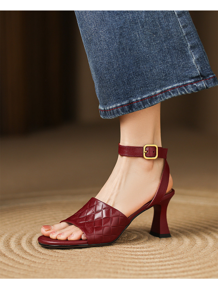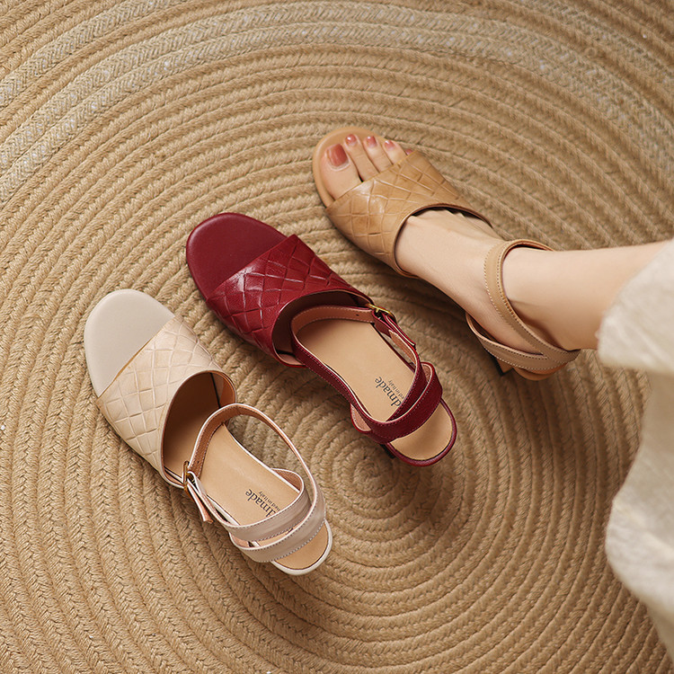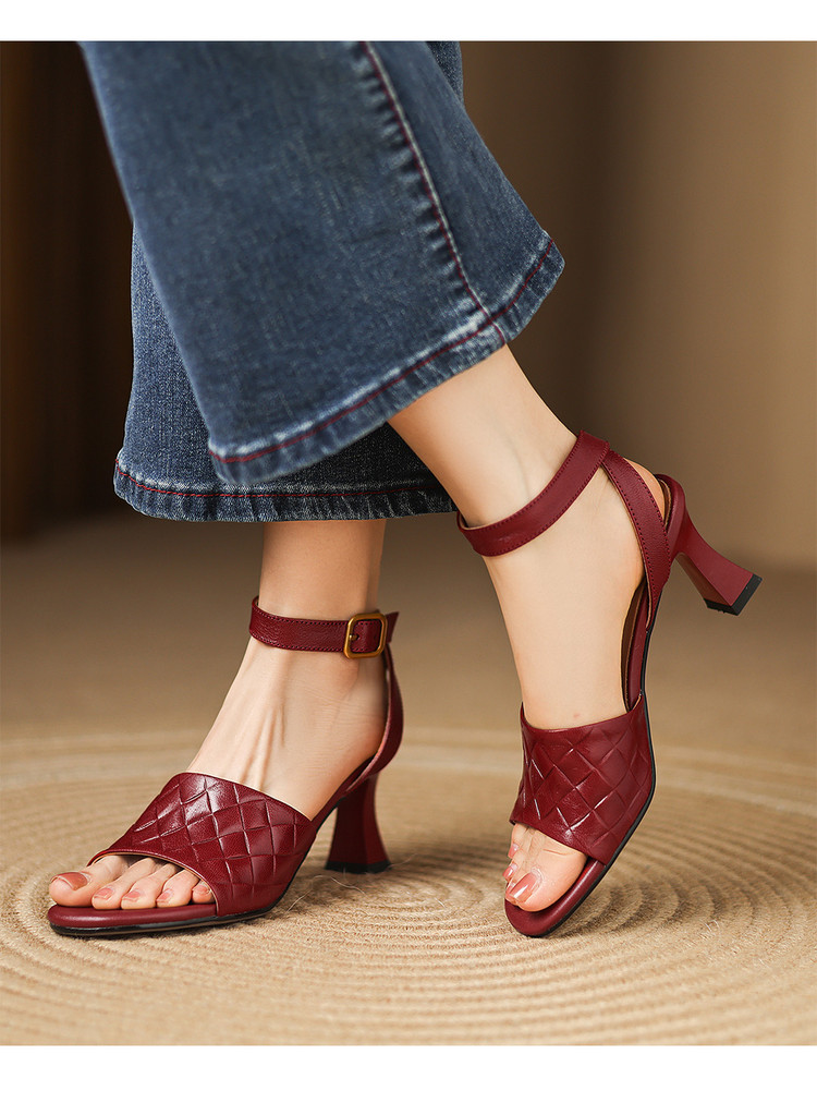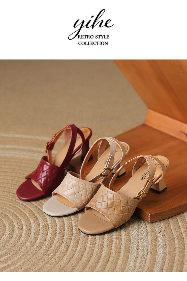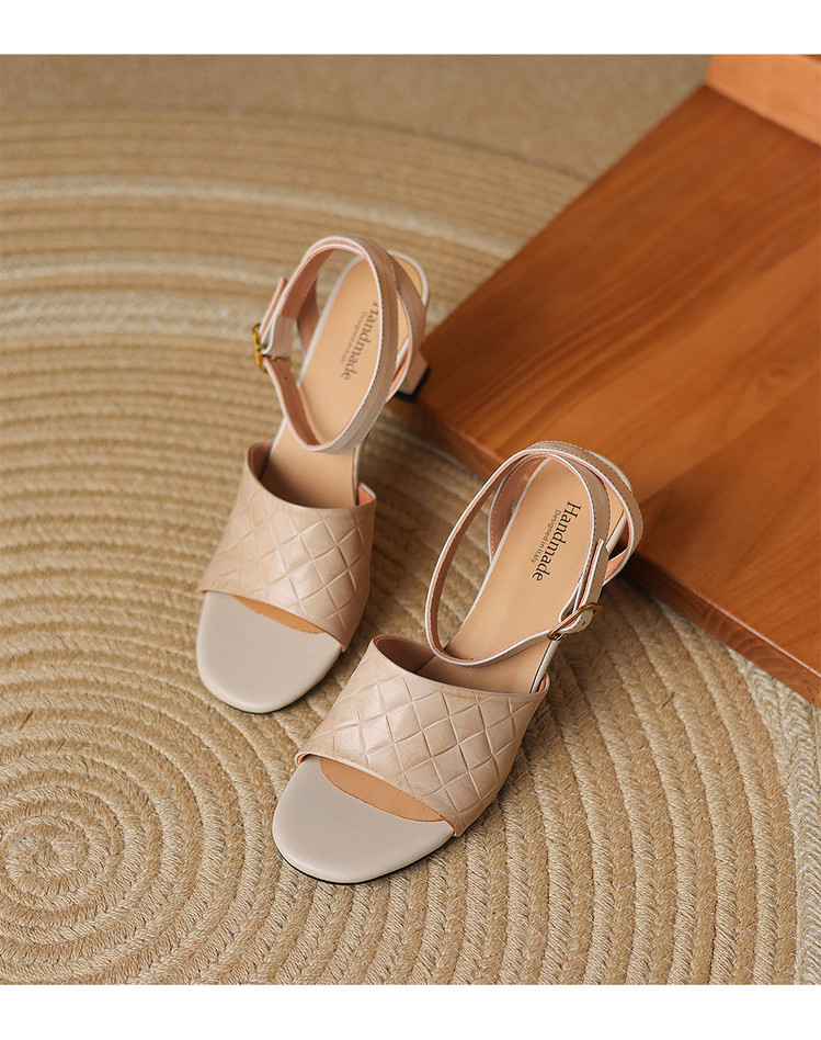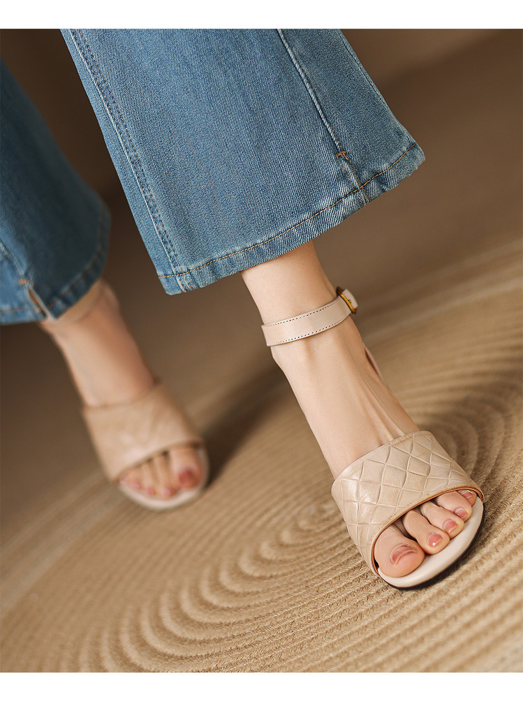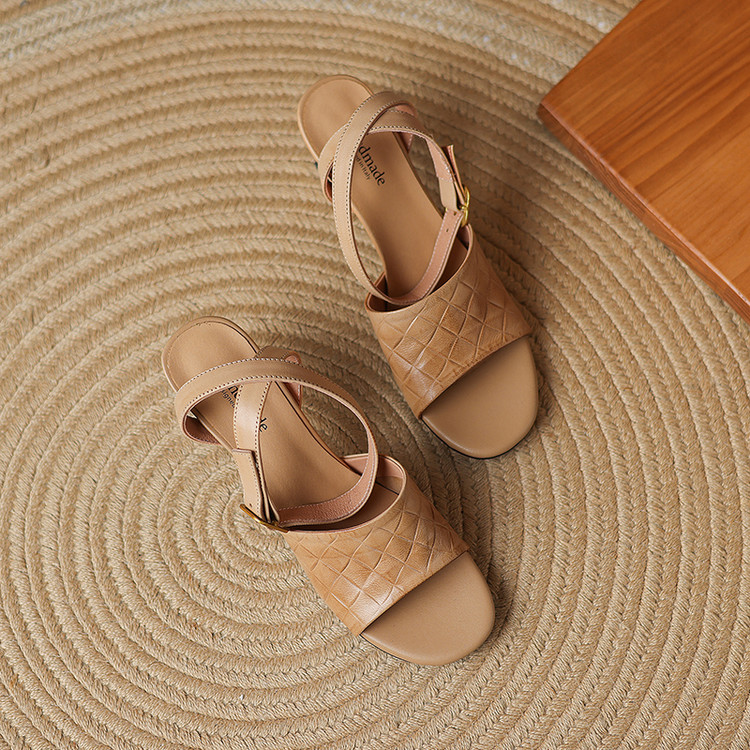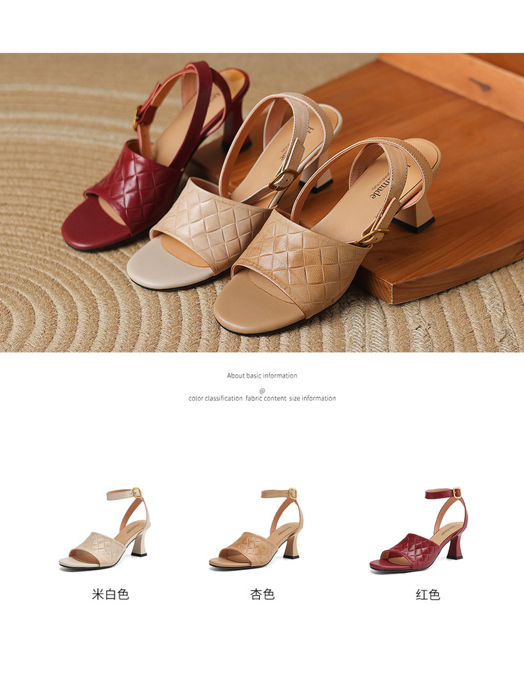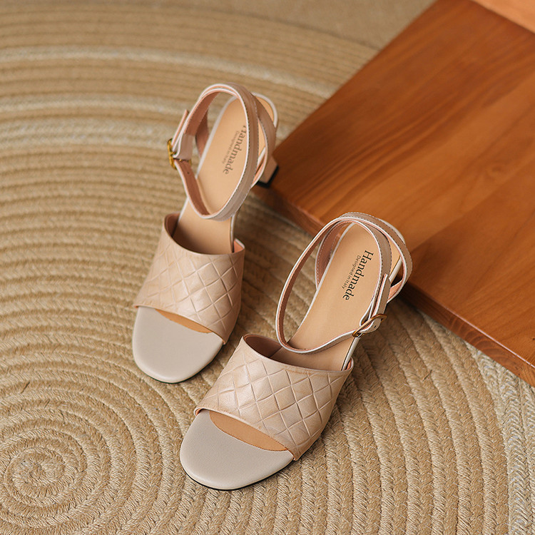【预售5天】真皮粗跟露趾凉鞋女夏新款压花一字带时尚高跟罗马鞋气质通勤凉鞋LD&7381