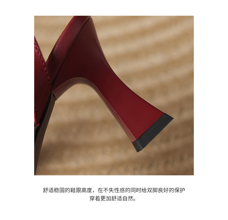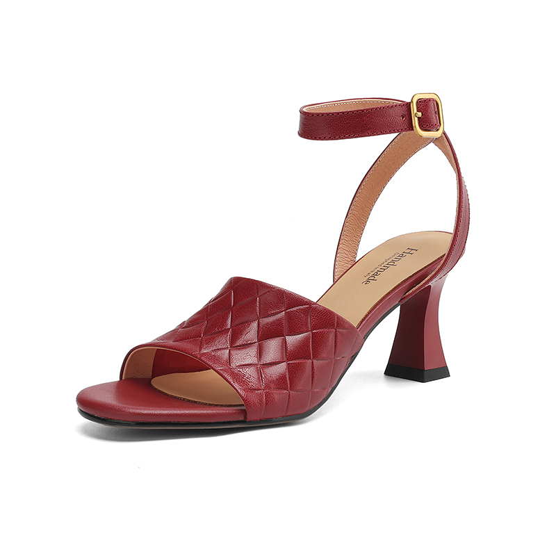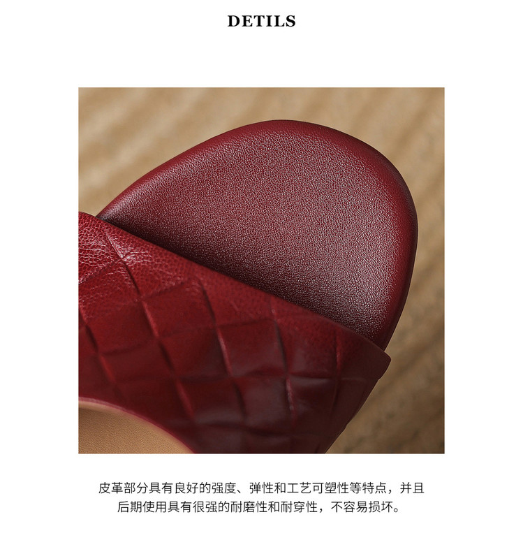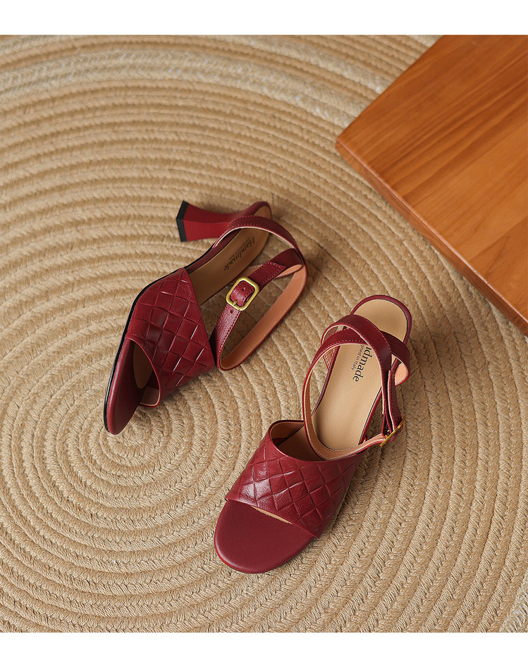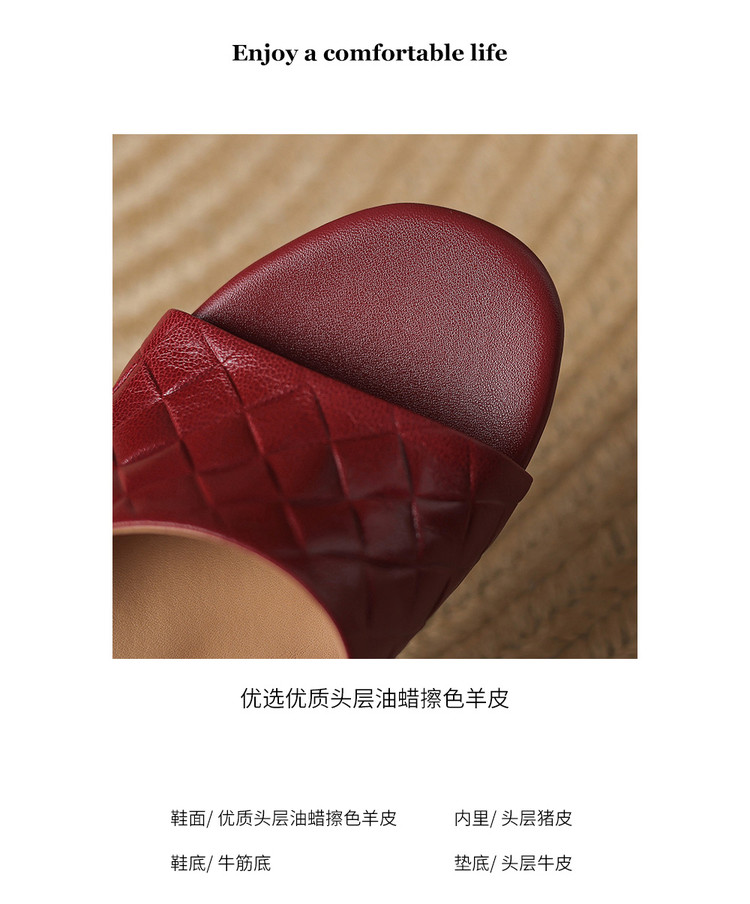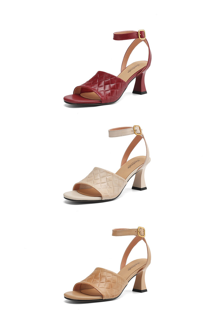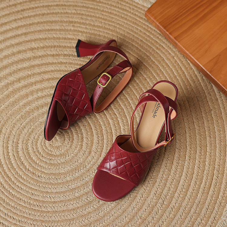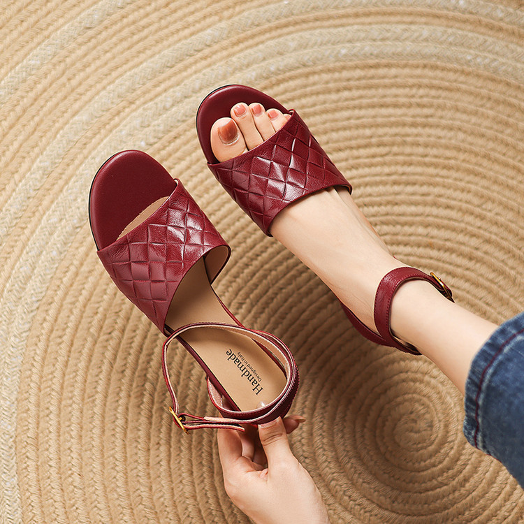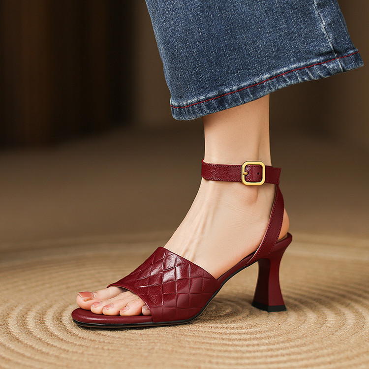 【预售5天】真皮粗跟露趾凉鞋女夏新款压花一字带时尚高跟罗马鞋气质通勤凉鞋LD&7381