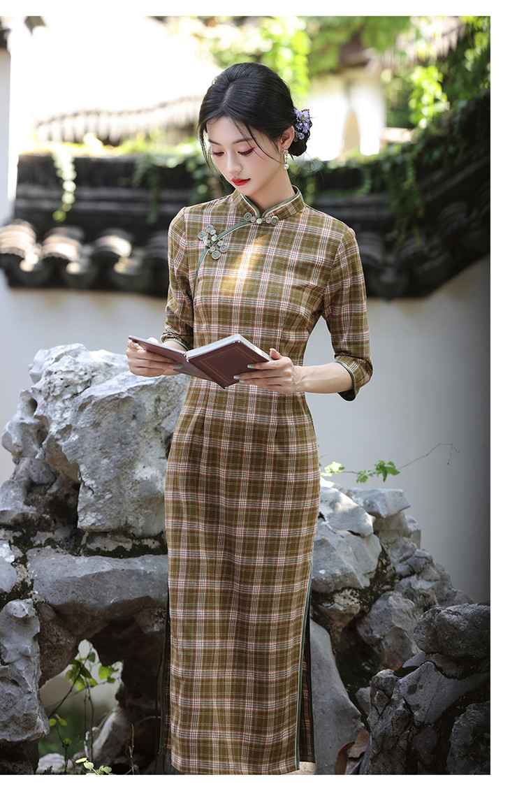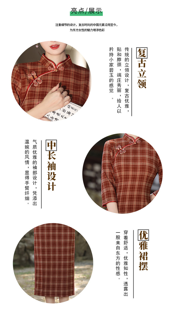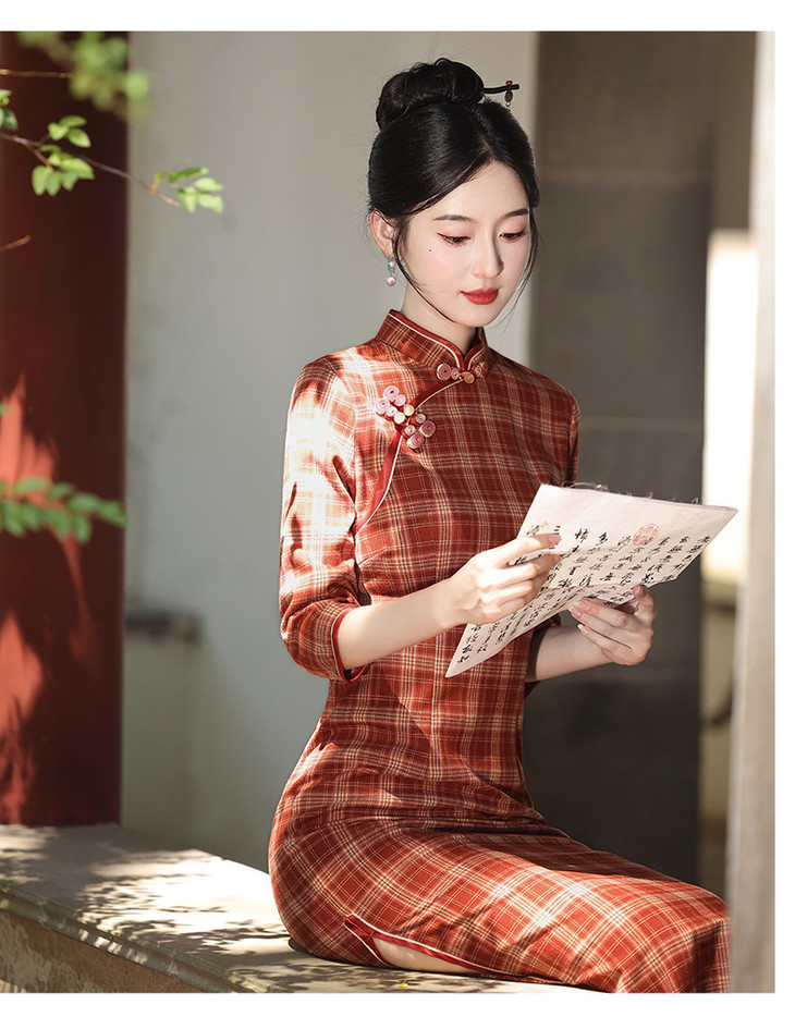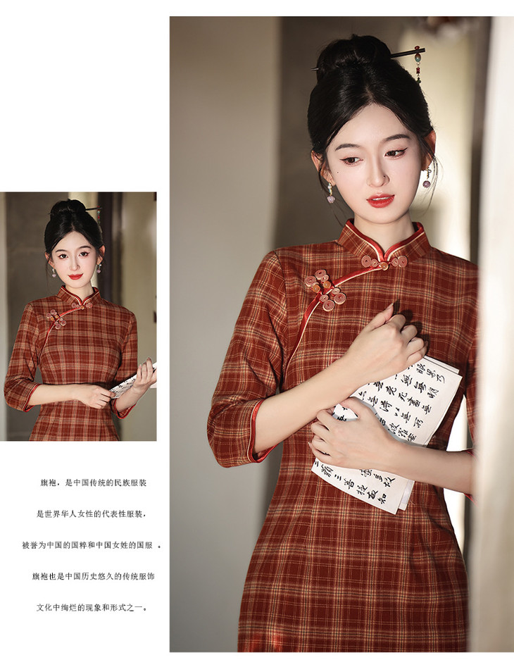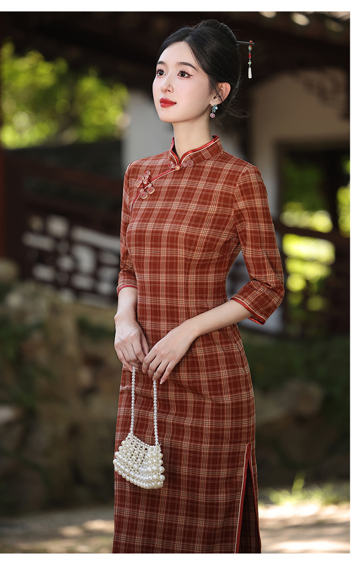 新款中国风日常改良旗袍红色格子长袖旗袍文艺复复古年轻款MLS7217