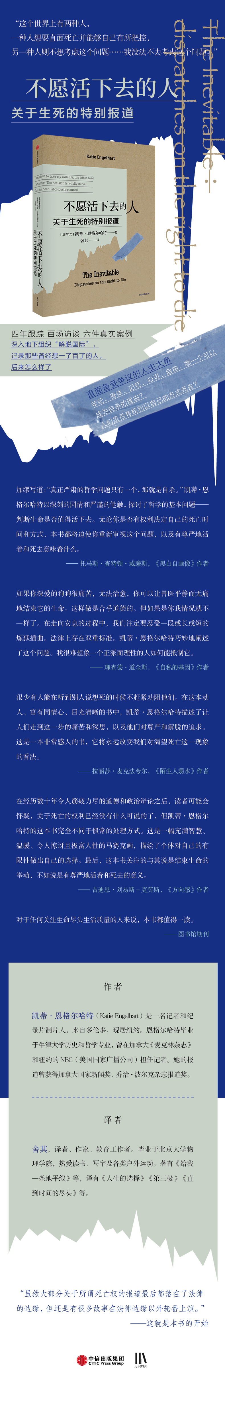 资深记者凯蒂·恩格尔哈特历时四年,跟踪访谈数百位不想活下去的人。他们或因疾病、或因衰老、或因难以忍受的精神痛苦…当生命注定无法好好地活,他们但求得好好地离去。