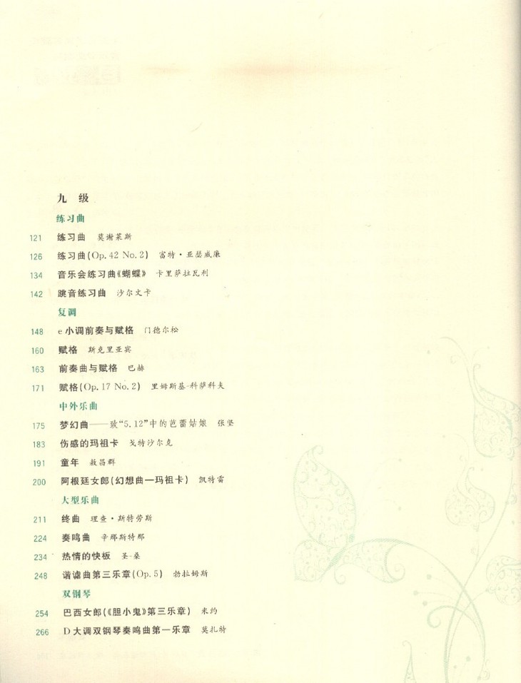 该书是第四册,包括第八级和第九级,选取了新作品如复调《板车号子》、乐曲《梦幻曲——致5·12中的芭蕾姑娘》、双钢琴《洪湖水,浪打浪》等。