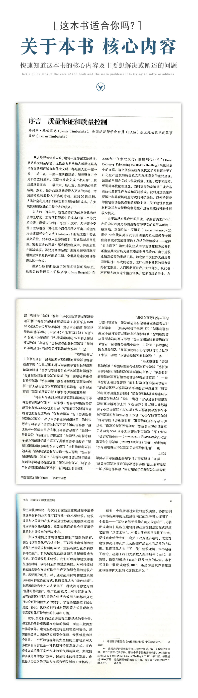 本书为建筑师、结构工程师和施工技术人员所写,是一本非现场施工指南,它系统预制建筑产生的背景、应用的原则以及实力,展示了应用组件、面板、模块进行建筑设计施工所面临的机遇和挑战,说明了现场施工的缺点以及预制建筑在整合建设项目流程、有效交付以及在项目周期中实现更多价值方面具有的优势。 主要内容包括三个部分,第一部分是工业化建筑的历史和背景,第二部分是预制建筑的应用(包括原则、基础知识、装配过程以及可持续发展),第三部分是案例研究,包括住宅和商业建筑,最后是结论。