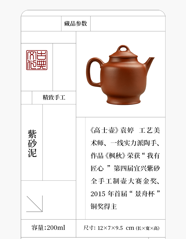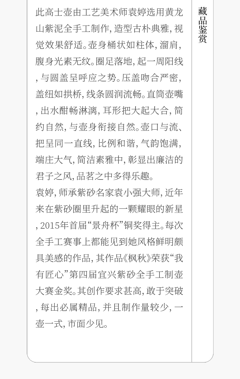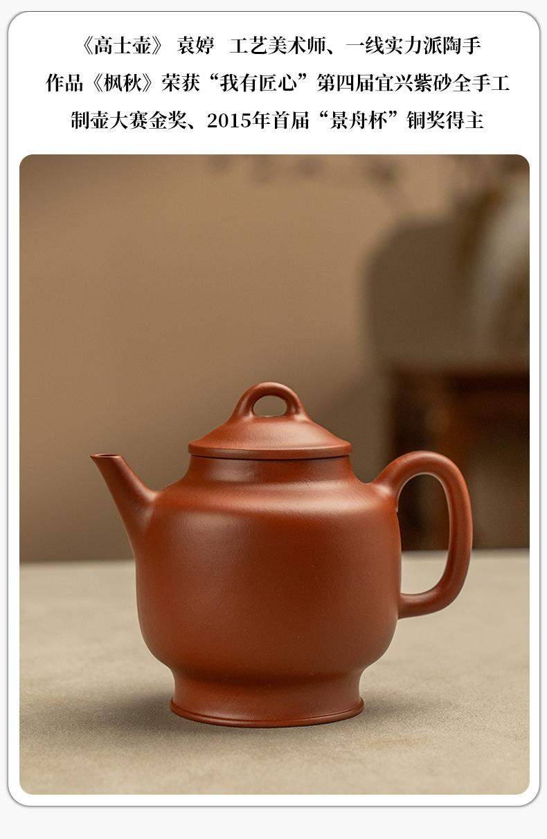 《高士壶》 袁婷 工艺美术师、一线实力派陶手、作品《枫秋》荣获“我有匠心”第四届宜兴紫砂全手工制壶大赛金奖、2015年首届“景舟杯”铜奖得主