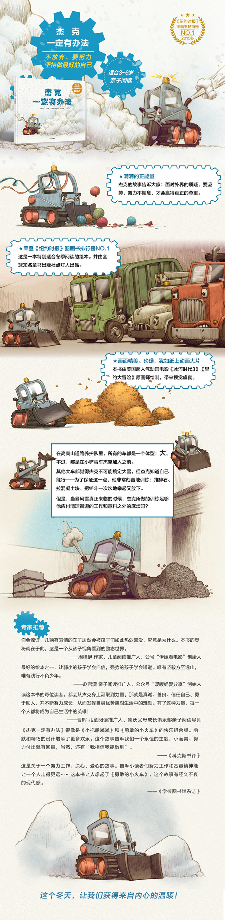 《杰克一定有办法》很像是《小拖船嘟嘟》和《勇敢的小火车》的快乐组合版。幽默和精巧的设计增添了更多欢乐。这个故事告诉了我们一个永恒的主题:小而美,努力付出就有回报,当然,还有“我相信我能做到”。