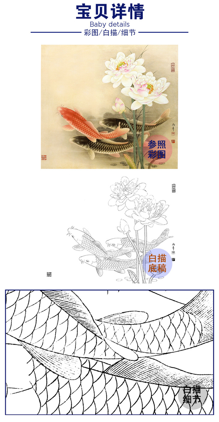工笔花鸟白描底稿-路雨年-荷花鲤鱼-斗方小品册页-A248