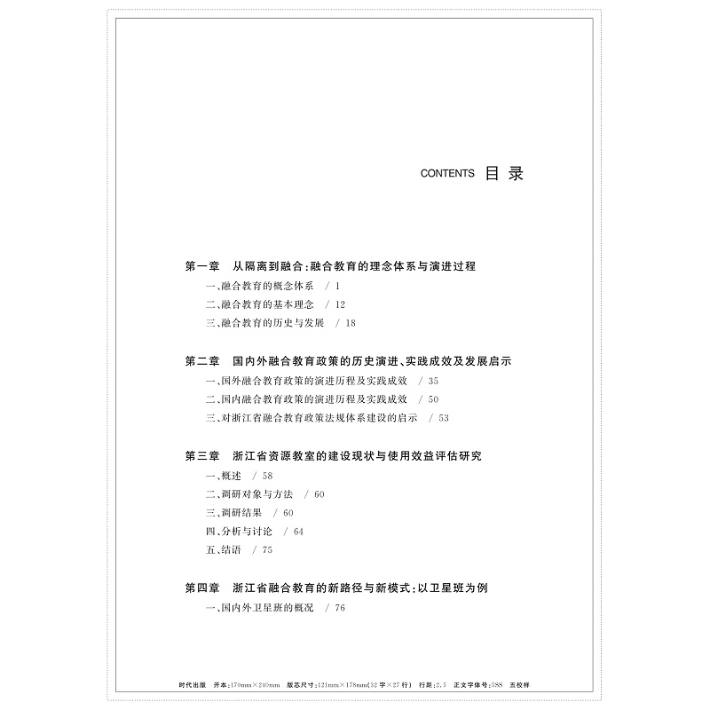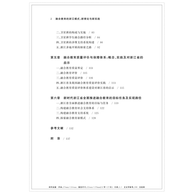 本书为浙江省教师教育创新实验区建设项目研究成果。本书主要内容如下:1.从隔离到融合:融合教育的概念、主要特征及核心内容;2.浙江省融合教育政策法规体系建设现状;3.浙江省县域幼儿园资源教室的建设现状、使用效益评估与实证研究;4.卫星班——浙江省融合教育的新路径与新模式;5.医教结合背景下基础教育学校康复教育的实践探索;6.浙江省基础教育学校融合教育质量保障与评估;7.新时代浙江省全面推进融合教育的目标任务及实现路径。