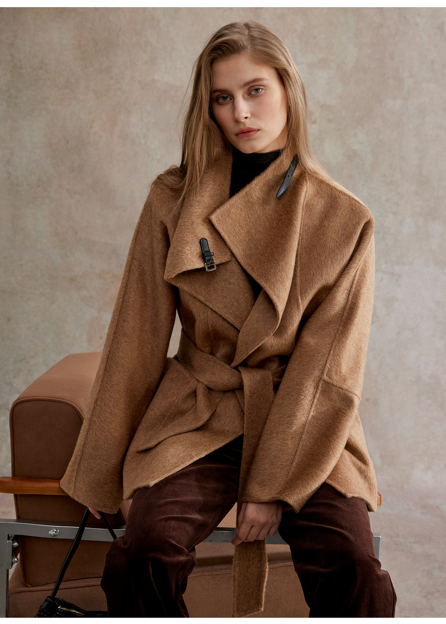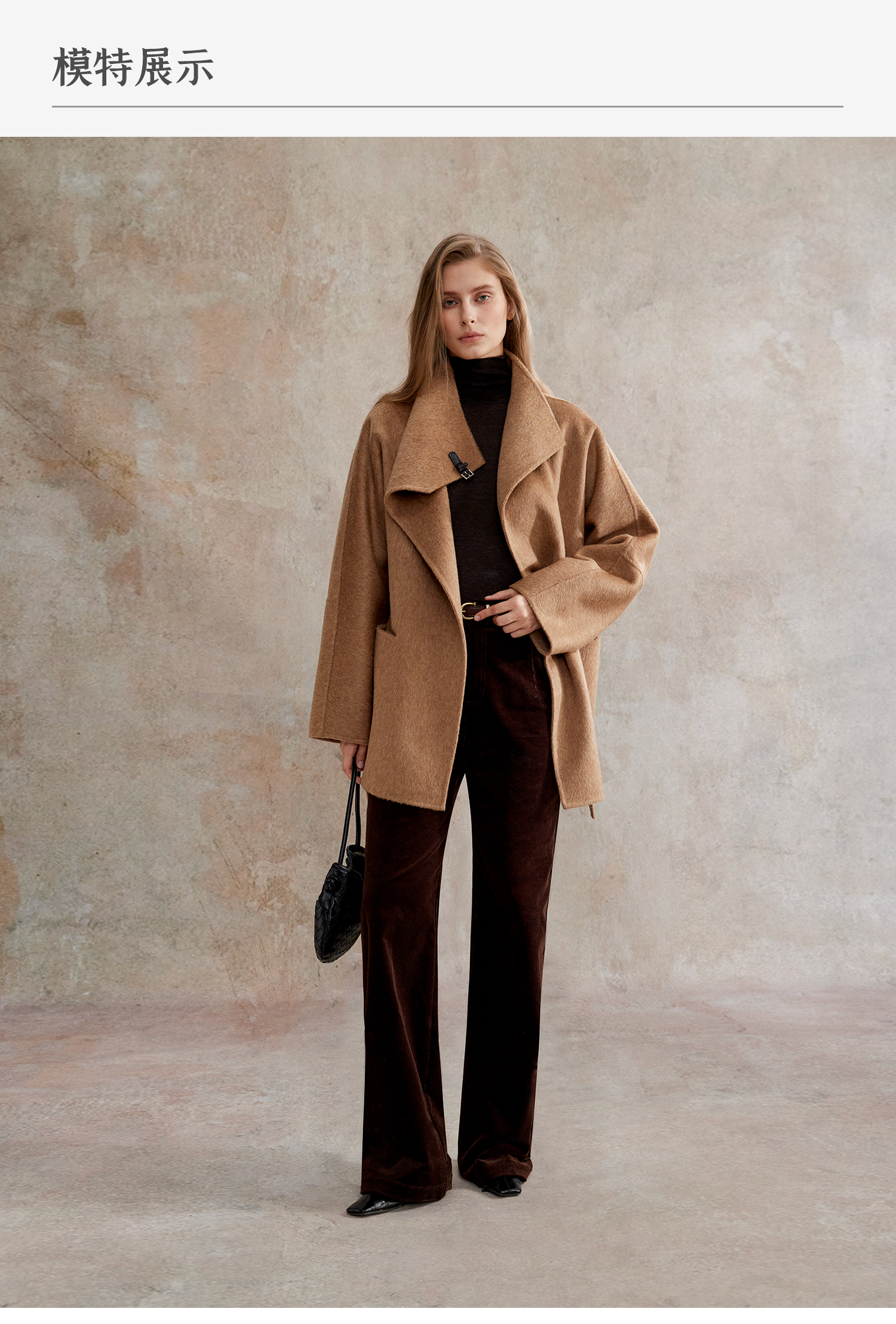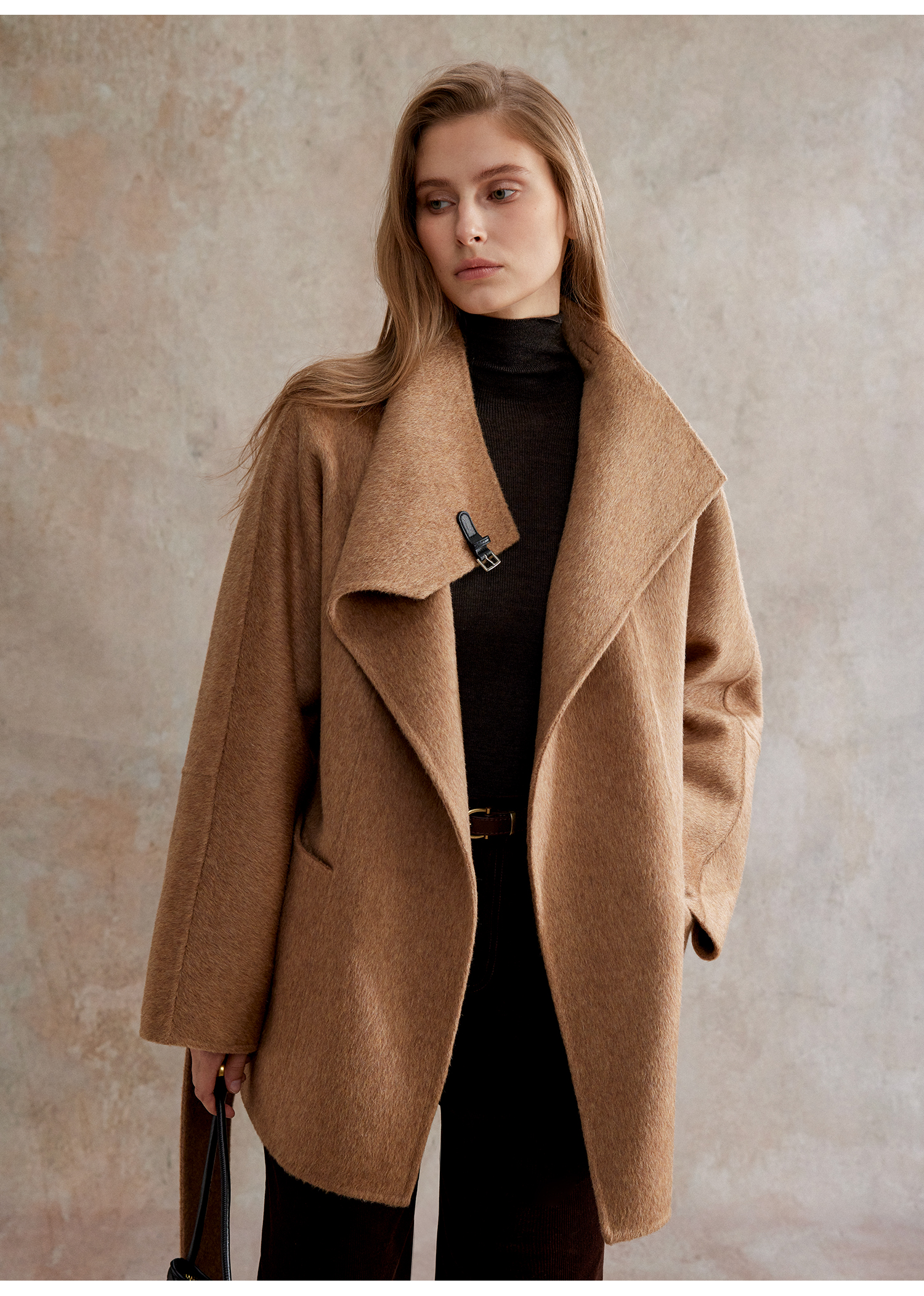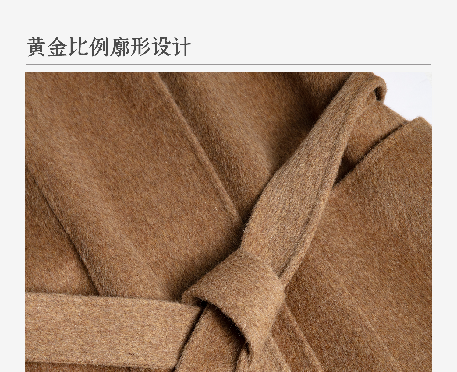 骆驼绒羊毛中长翻领皮袢系带收腰双面尼大衣DY2504071