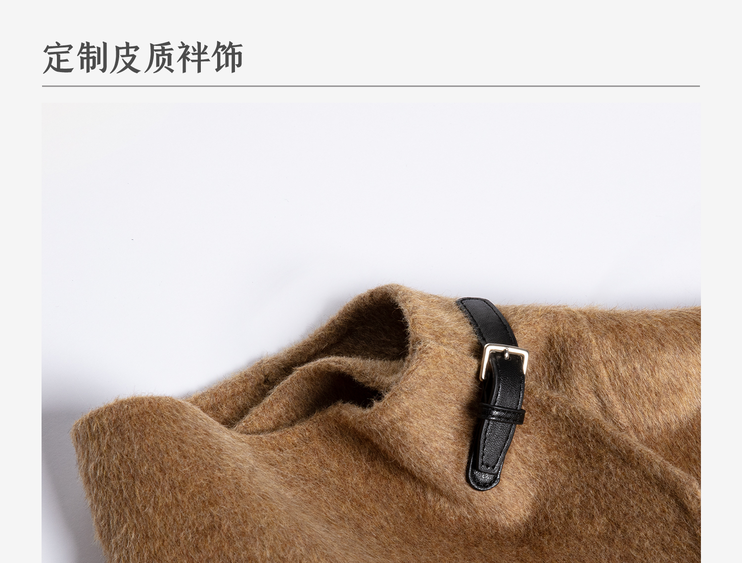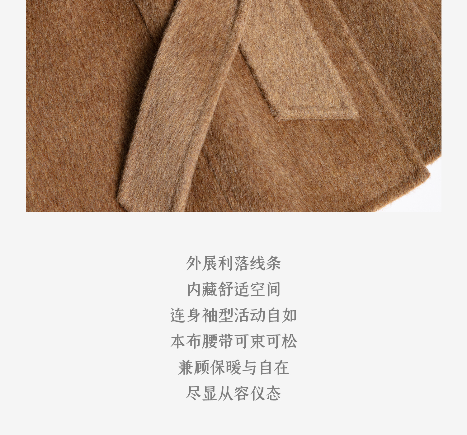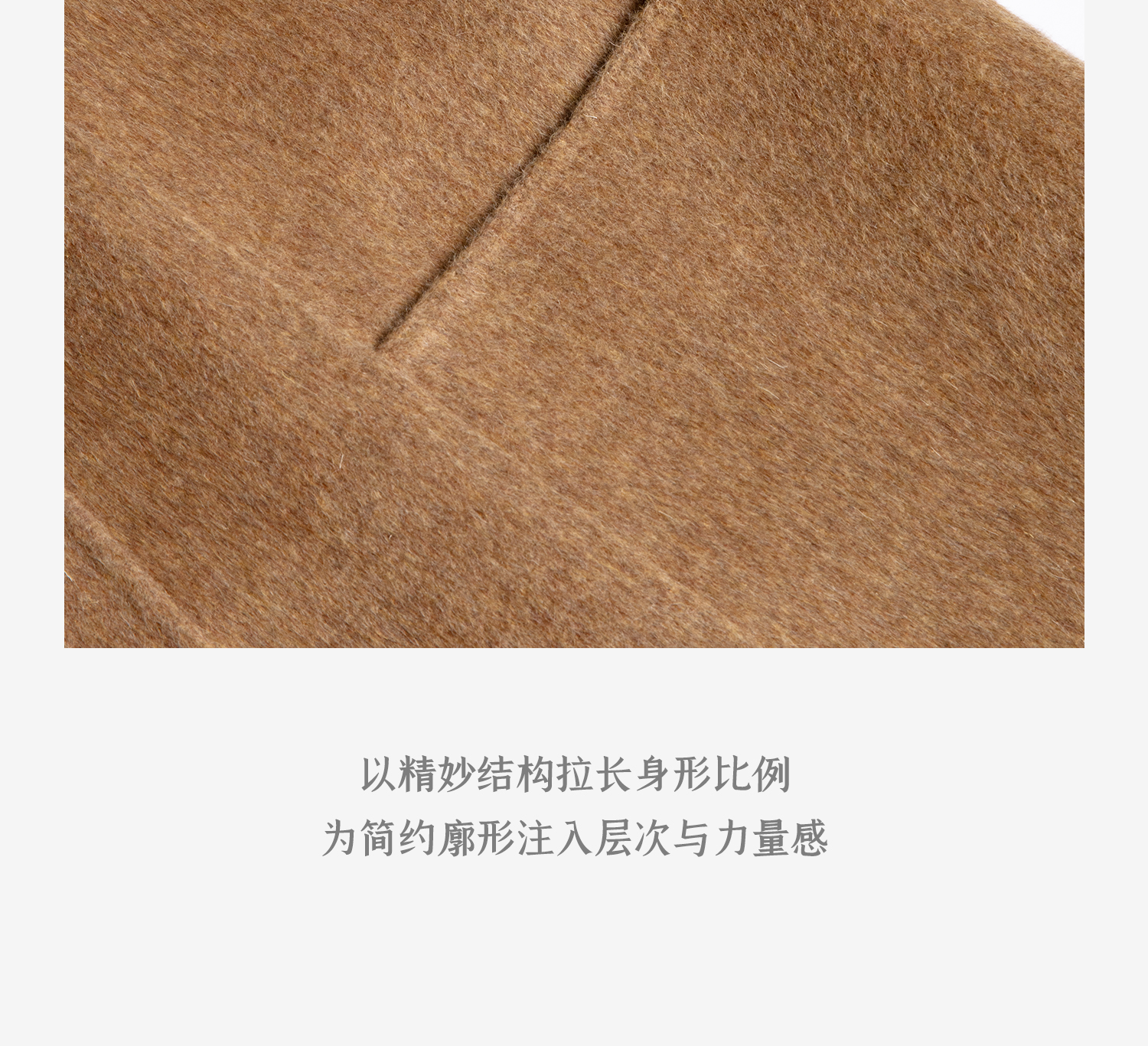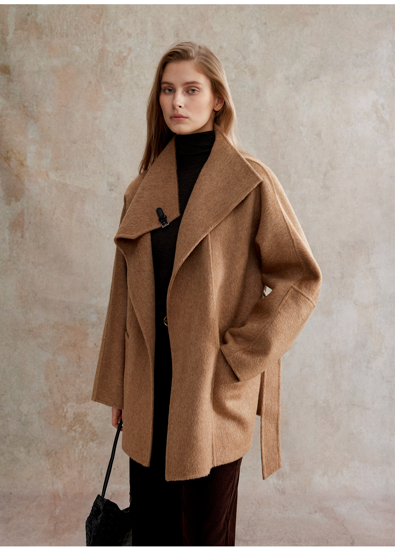 骆驼绒羊毛中长翻领皮袢系带收腰双面尼大衣DY2504071