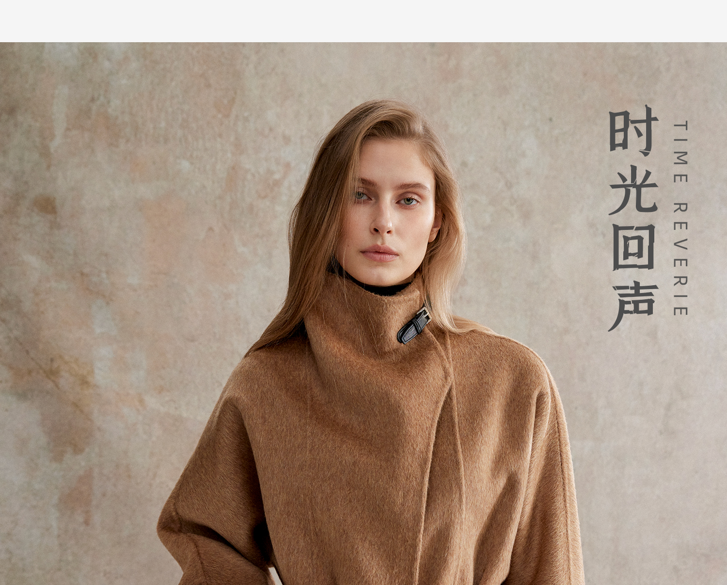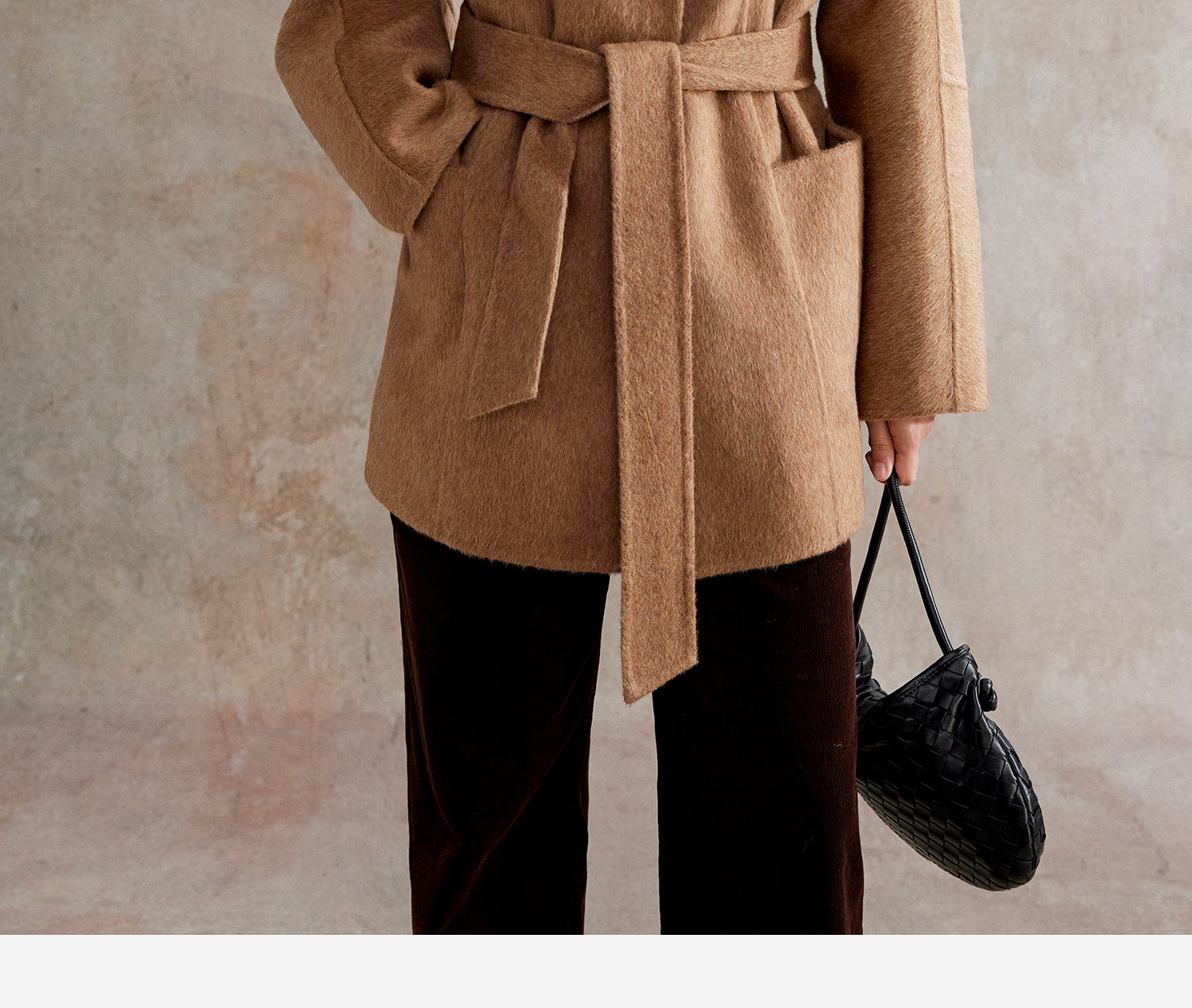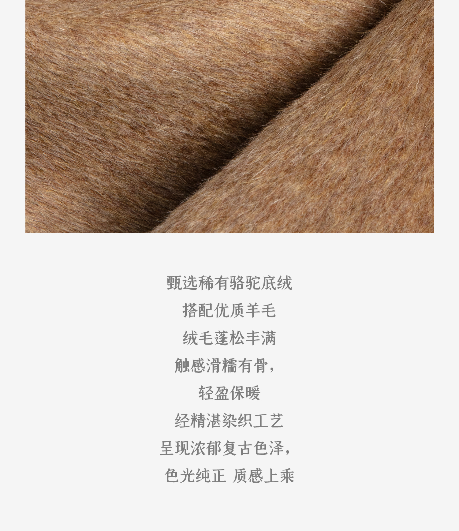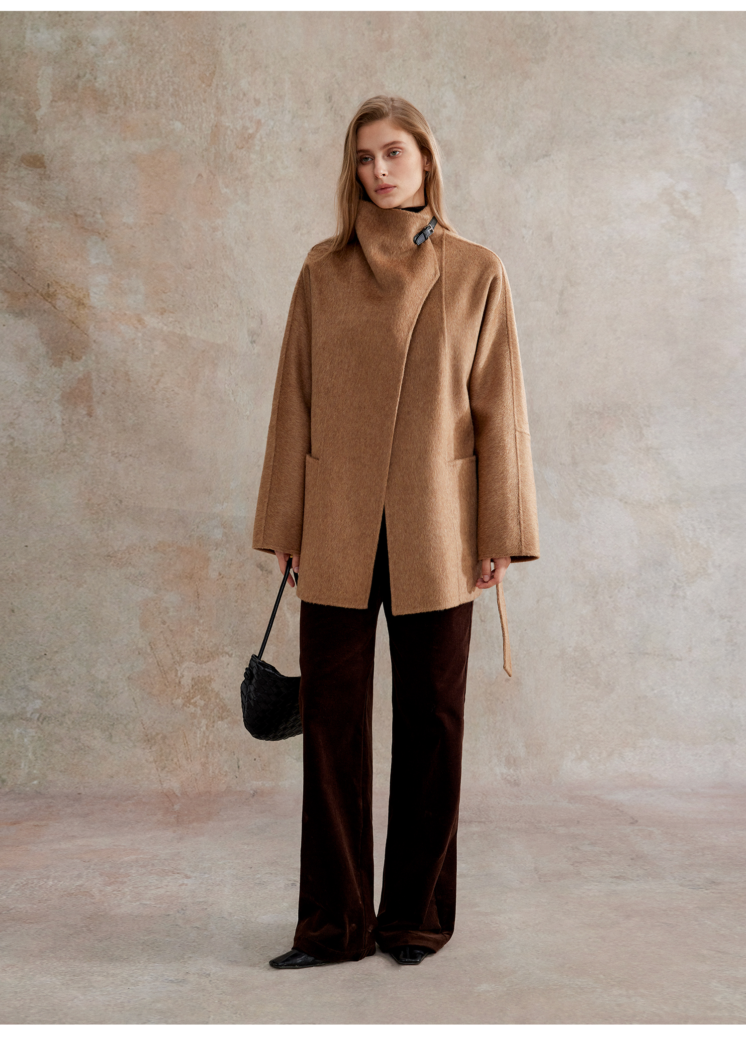 骆驼绒羊毛中长翻领皮袢系带收腰双面尼大衣DY2504071