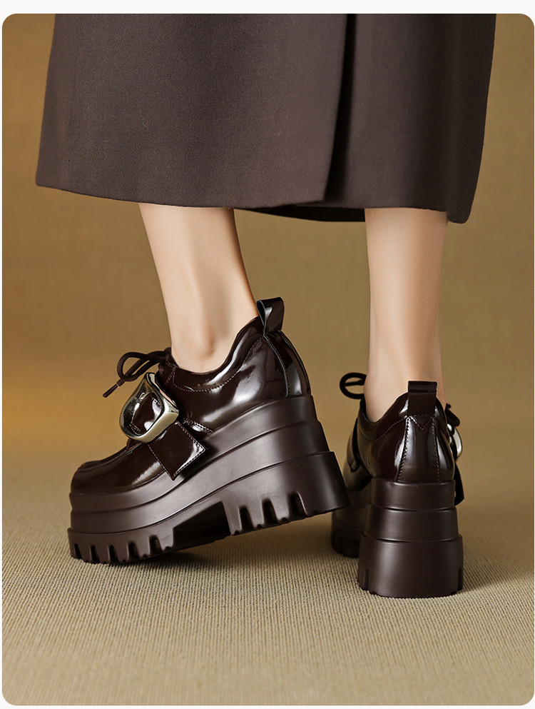 【预售5天】真皮厚底增高小皮鞋女新款爆款复古乐福鞋英伦风系带皮带扣女单鞋MQE&G144-1