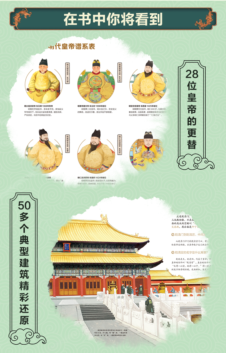 明清两个朝代的28位皇帝哪些在故宫里留下了故事,故宫见证了他们的兴衰沧桑,也在他们的更迭中沉淀着独特的文化魅力。有的皇帝一辈子没有见过完整的三大殿,有的皇帝胆子太小搬出了故宫,有的皇帝在故宫里勤勉工作60多年,有的皇帝在故宫开启了一个全盛时代……皇帝故事多,我们在故事中学习明清历史。