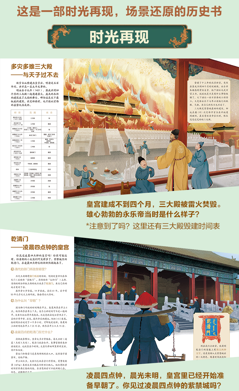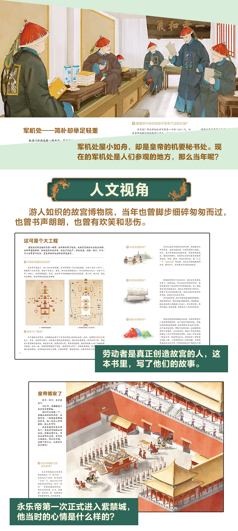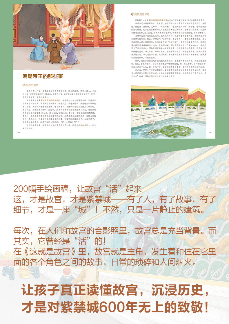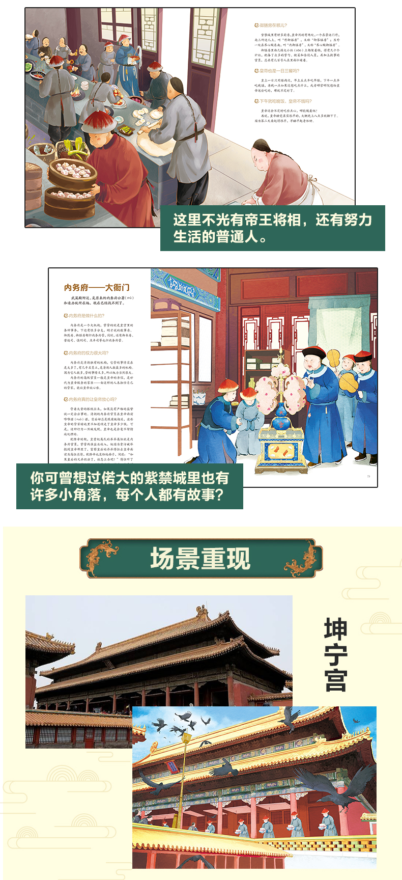 我们的手绘找的是派糖童书团队,派糖童书是国内童书插画特别棒的团队,和其团队人员反复沟通后,我们采用的是电影剧照的手法,作者就是这套书的编剧,派糖童书团队就是导演,画手就是演员,我们作者和画手团队进故宫十多次,目的是让画手能够更好的理解明清时期的帝王将相、太监宫女在紫禁城的工作和生活。画手能够把当时的场景还原出来,让读者能够看到穿越回明清时期的场景,让读者能够更好的体会明清时期紫禁城的工作和生活场景!