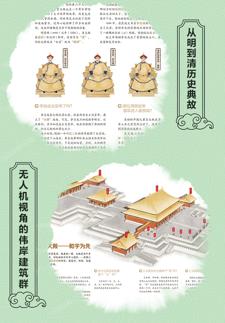 我们讨论过无数种方案,*后定在用自问自答的方式把有关于故宫的知识点提炼出来,让小朋友能够一目了然的知道其中的各种知识,每个知识点各自独立,同时所有的知识点又连贯融合,让小朋友读起来既没有压力,又能够轻松的掌握故宫的历史、人物、文化、建筑等等知识点。