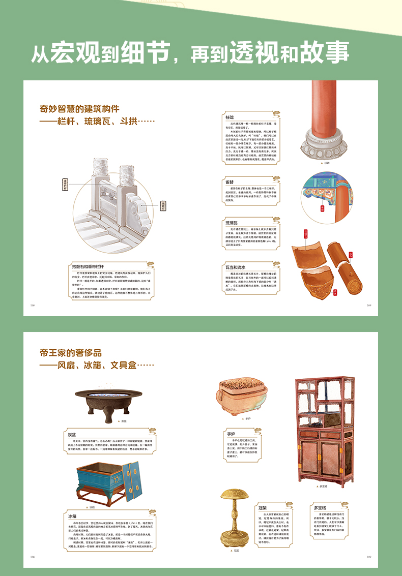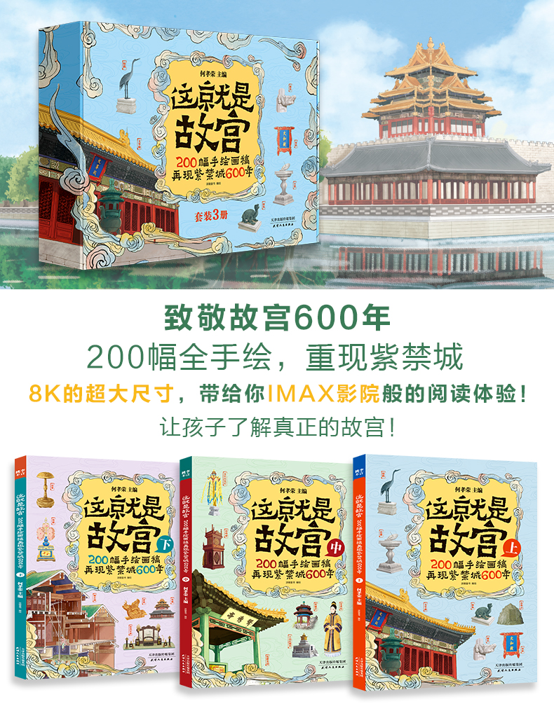 我们采用电影剧照的手法,用手绘的方式展现,穿越回明清时期紫禁城的真实场景,用200多幅手绘稿带你足不出户地了解故宫600年的历史,一套书还原这座世界上*的木结构建筑群,从建筑到景观,从器物到人物,从时间到空间,一眼千年,看不尽的故宫之大美。
