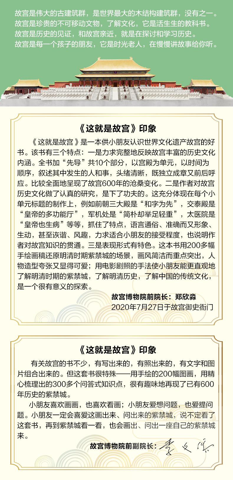 历时三年,我们终于完成了这套书的创作,接受读者的检验,希望能够得到我们家长和小朋友的认可和喜爱。正如李李文儒院长看了这套书之后对这套书的评价:有关故宫的书不少,有写出来的,有照出来的,有文字和图片组合出来的。但这套书很特殊——用手绘的200幅图画,用精心梳理出的300多个问答式知识点,很有趣味地再现了已有600年历史的紫禁城。 小朋友喜欢画画,也喜欢看画;小朋友爱想问题,也爱提问题。小朋友一定会喜爱这画出来、问出来的紫禁城,说不定看了这套书,再到紫禁城看一看,也会画出、问出一座自己的紫禁城来。希望小朋友读完这套书之后能够更加的喜欢故宫,喜欢中国文化。