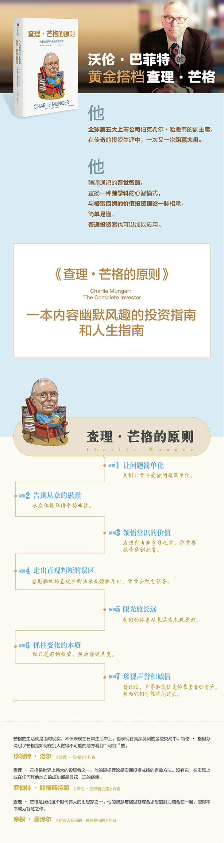 查理·芒格的原则 关于投资与人生的智慧箴言。与以往很多理财书的严肃风格不同,本书内容偏向幽默风趣,既是一本投资指南,也是一本商业指南。