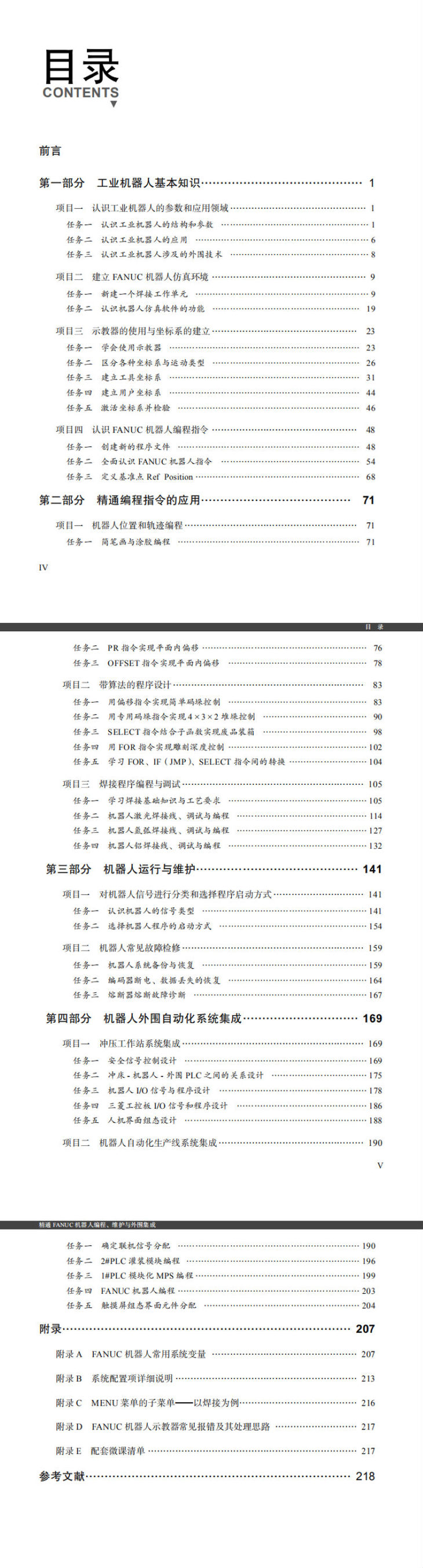 对于机器人的学习者和技术员来说,学习一款机器人后对自学其他机器人应能触类旁通,在各大机器人品牌中 FANUC机器人的编程、示教、使用规范是最细致的,学习 FANUC机器人编程后自学其他品牌的机器人会变得轻松。《精通 FANUC机器人编程、维护与外围集成》由浅入深,从项目入手,引导初学者在动手的过程中理解机器人的基本工作原理和应用时涉及的概念,用最低的成本掌握机器人技术。《精通 FANUC机器人编程、维护与外围集成》分为四部分:第一部分着重讲解 FANUC机器人使用时涉及的软硬件概念,利用仿真软件建立工作环境,让读者对 FANUC机器人有全面认识;第二部分通过项目训练编程指令的应用,聚焦程序算法的设计,讲述如何最快、最低成本学会机器人编程;第三部分详细分析机器人使用过程中的常见问题、故障排除,每个问题阐明解决步骤;第四部分通过典型的机器人工作站系统集成项目让读者明确机器人外围集成的方法,如何利用“立体编程”思维实现多向的机器人系统集成。