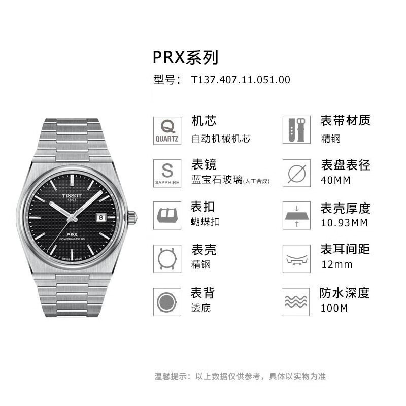 【时计廊】天梭(TISSOT) 瑞士手表PRX超级玩家系列机械表钢带男士腕表 夜幕黑盘钢带T137.407.11.051.00