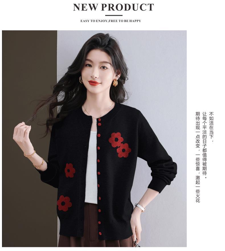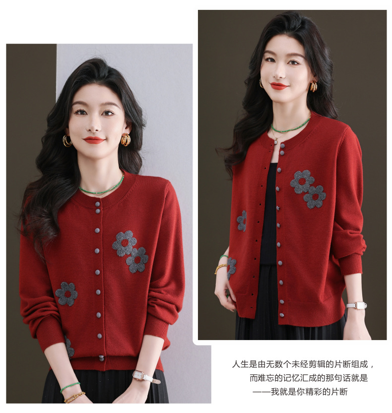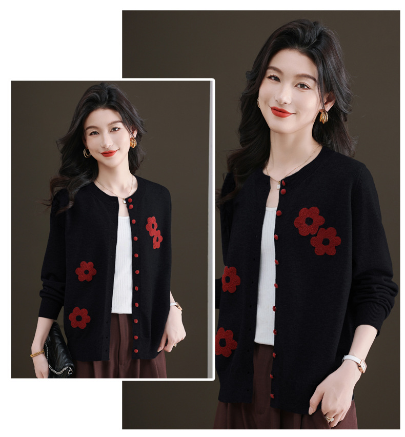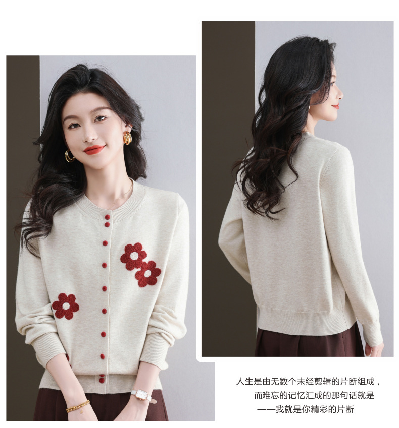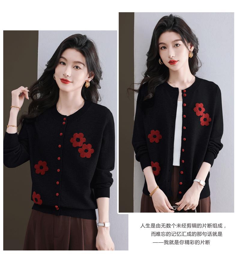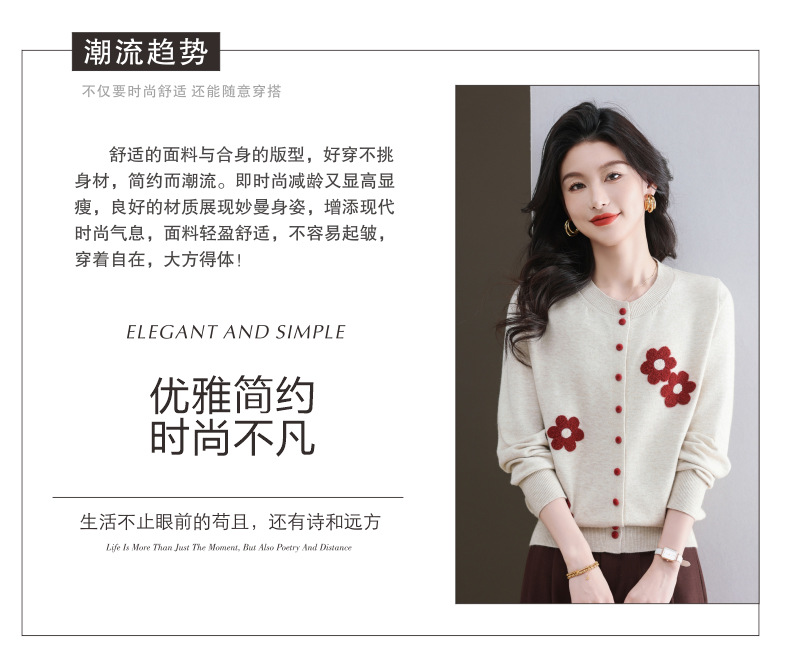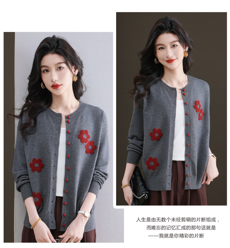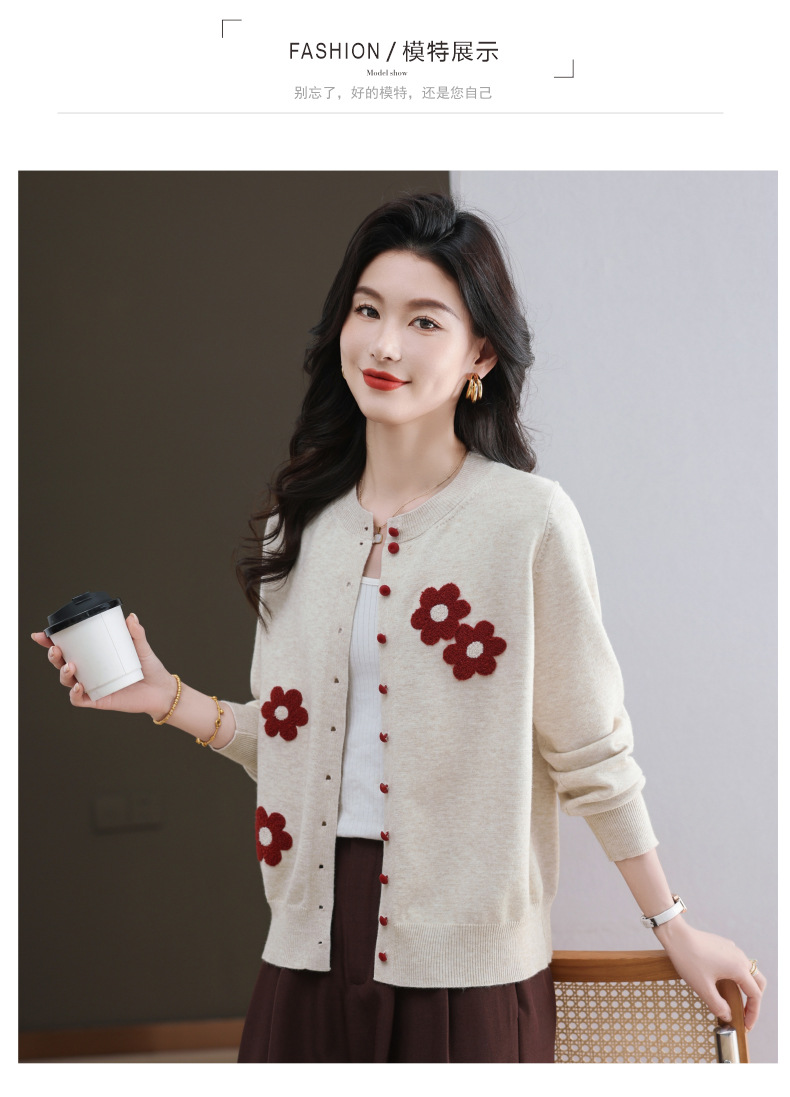 CC-11-9115小个子针织开衫女士2025春秋季新款洋气提花朵圆领薄外套外搭上衣